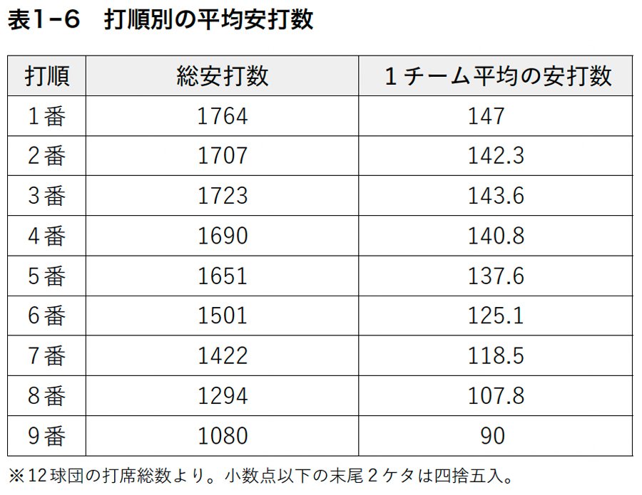 トータルでの打席数が多い1番が最多安打していますが、2番より平均13.6打席も少ない3番が、安打数で上回っています。2番より28.4打席少ない4番も1.5安打しか変わりません。2番と3番、もしくは2番と4番の順番が逆なら、安打数はもっと変わっているはずでしょう。