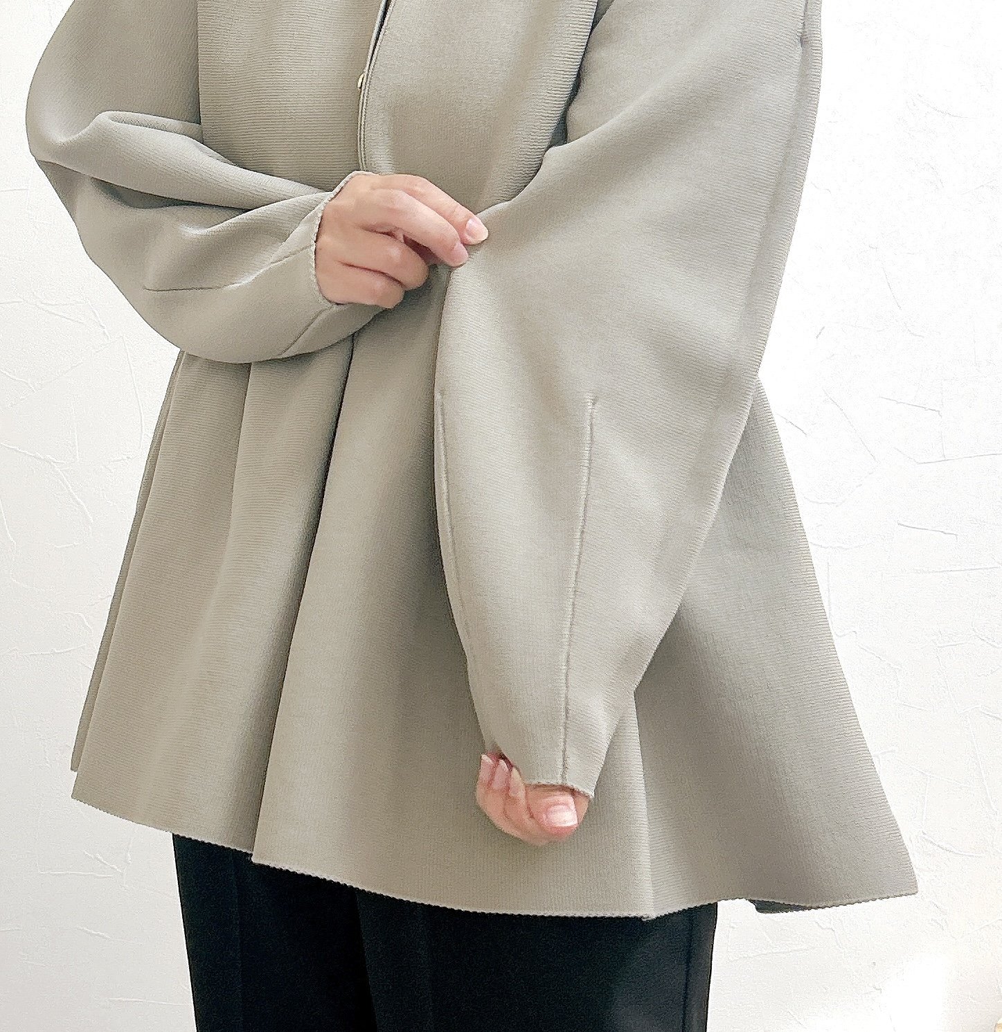 腕まわりはゆったりしていますが、袖に向かって細くなっていくポワンとしたシルエットも素敵!袖口には縫い目のラインが入っていて、腕をキュッとほっそり見せてくれますよ。
