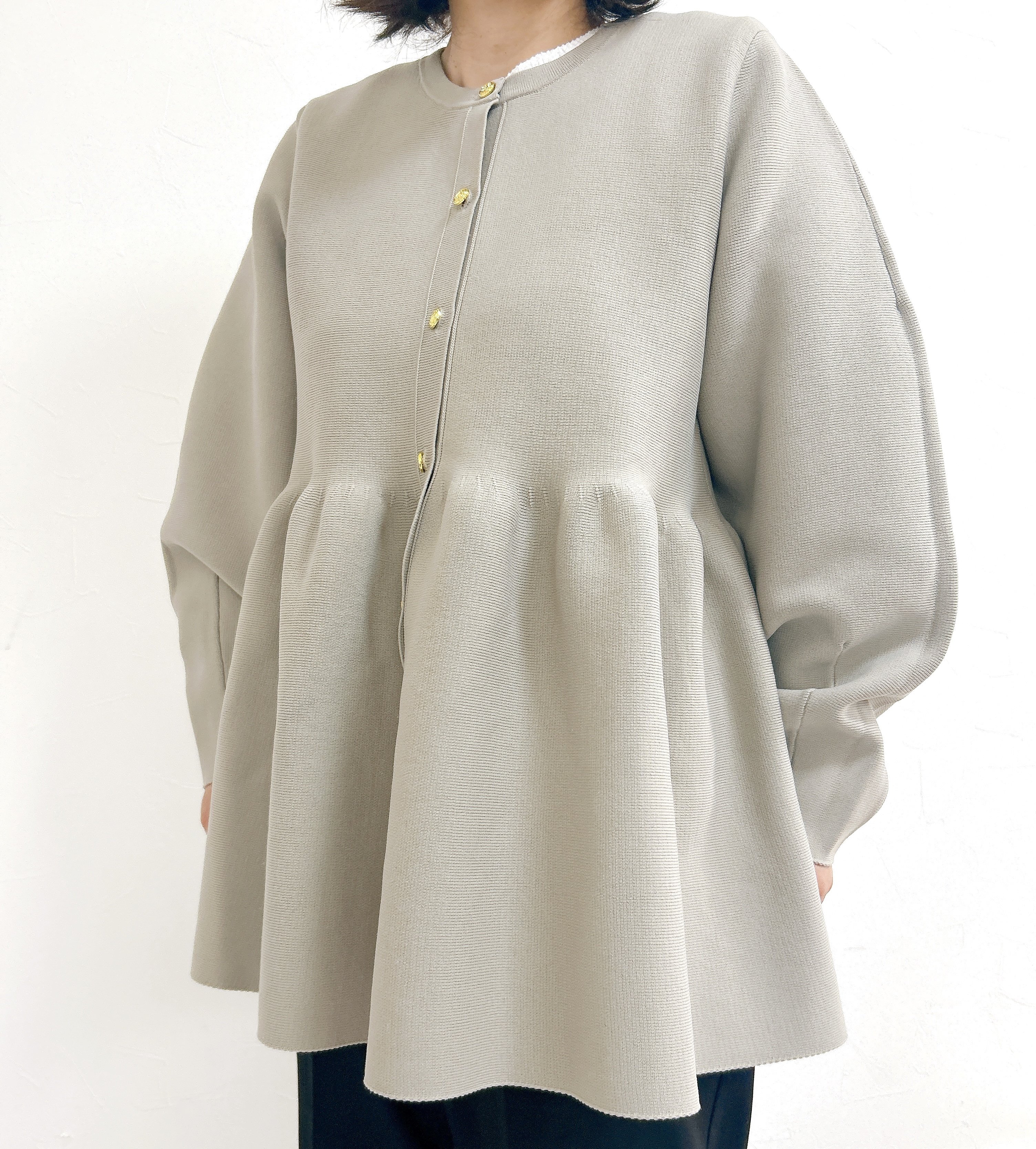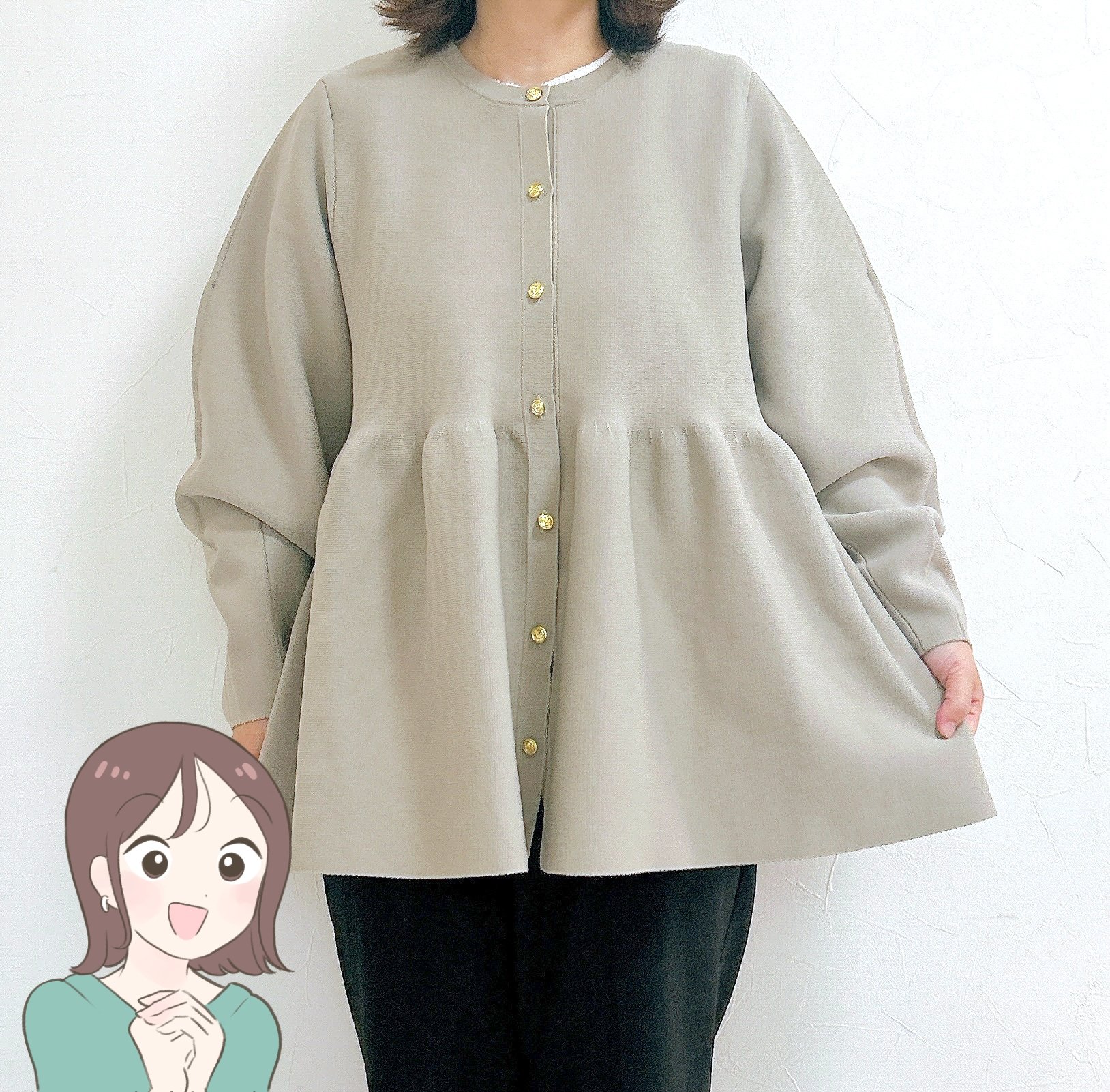 ウエスト部分から裾にかけてふんわり広がった、ペプラムデザインのカーディガンです。まるでスカートをはいているような見た目でとっても華やか!