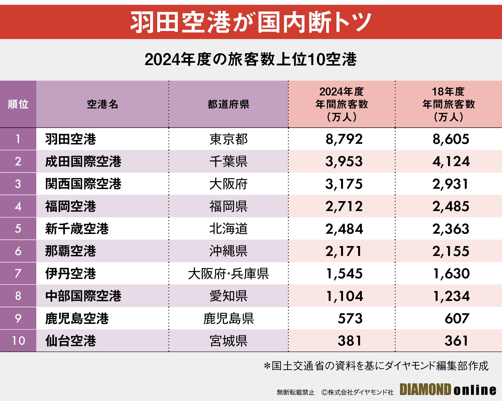 各空港にもにぎわいが戻っている。全国97空港のうち、最も旅客数が多かったのは羽田空港だ。24年度の年間旅客数は8792万人で、コロナ前の18年度(8605万人)を187万人上回った。