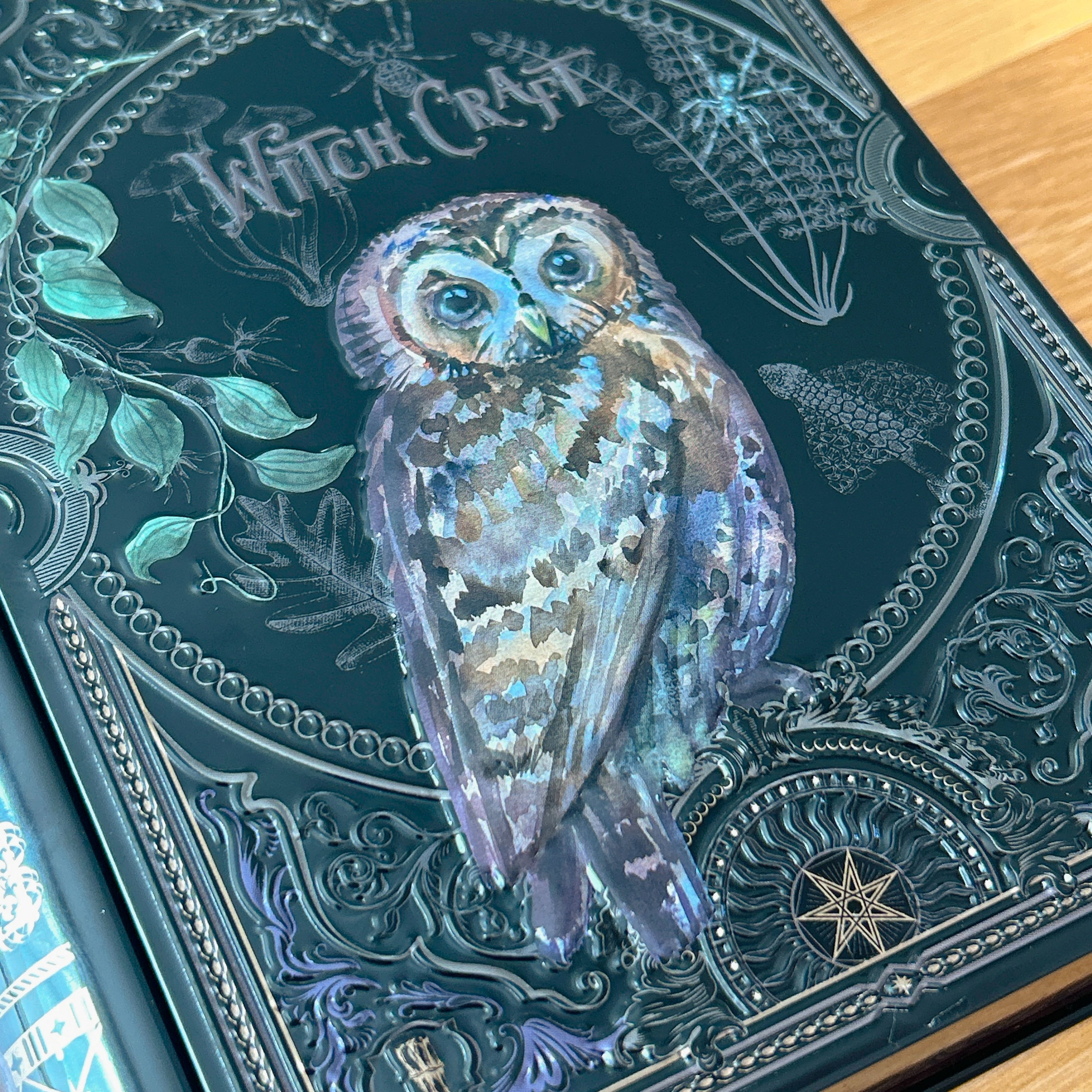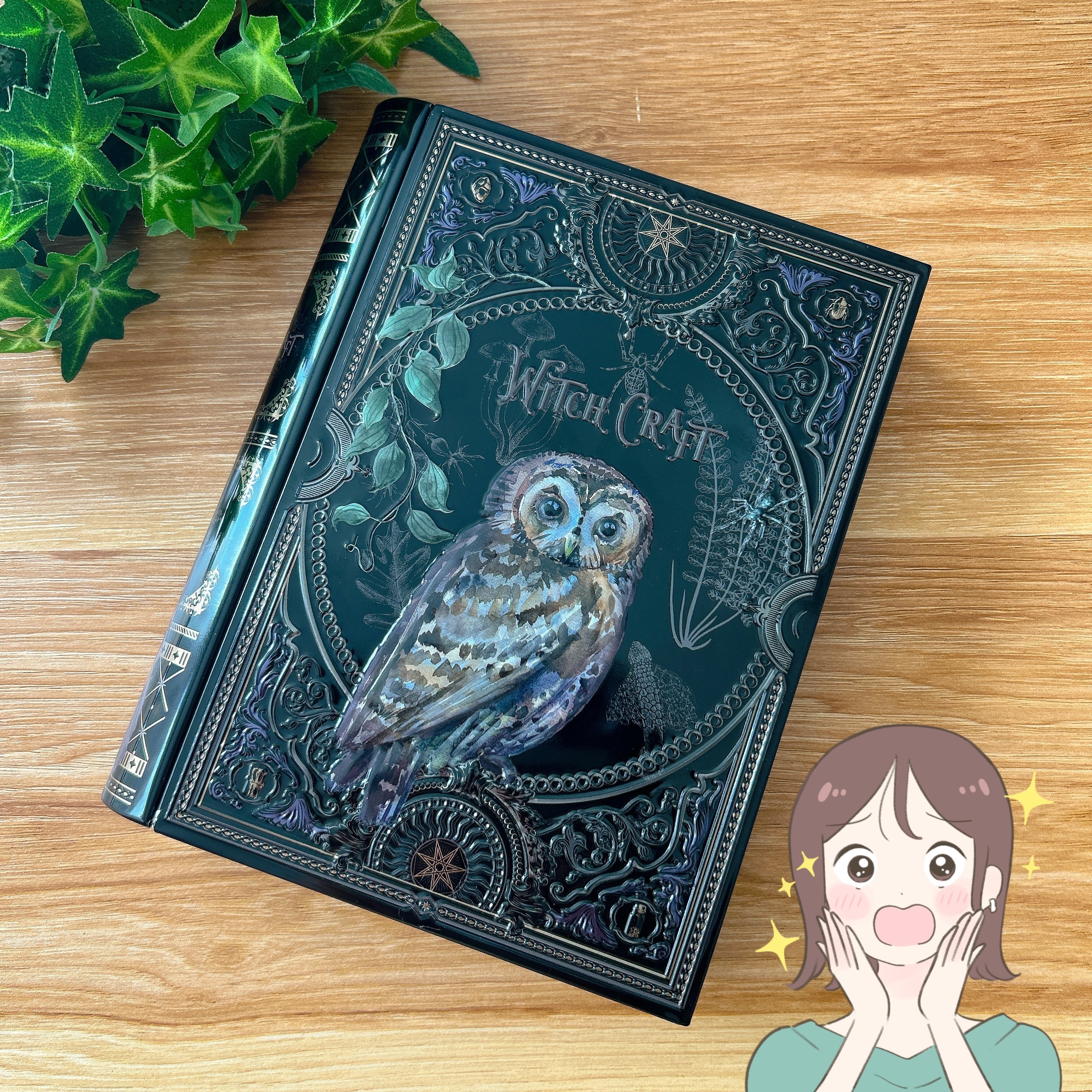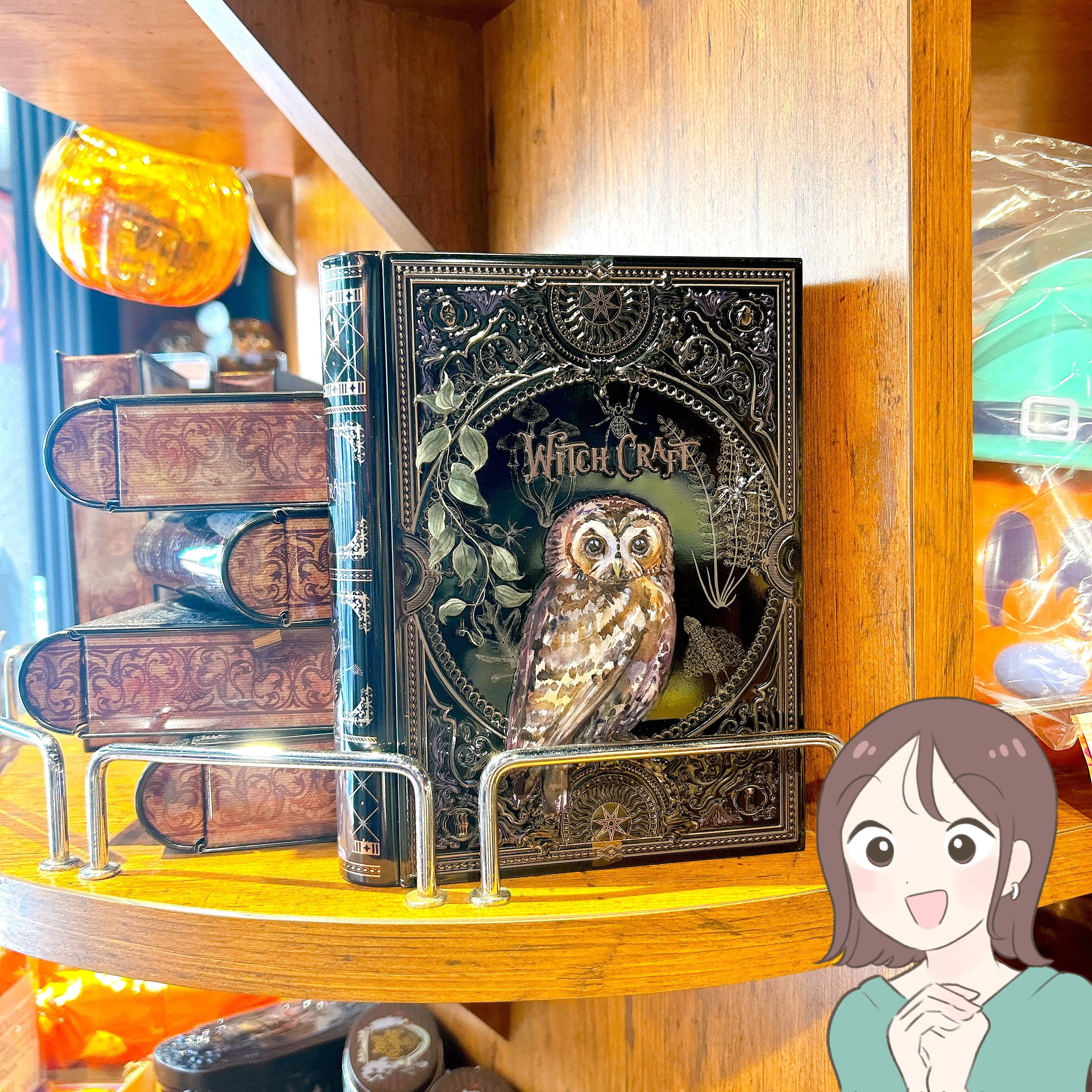 洋書のようなデザインをした四角い形のクッキー缶です。真ん中にはフクロウのビジュアルがリアルなタッチで描かれていて、魔法界の雰囲気たっぷり!