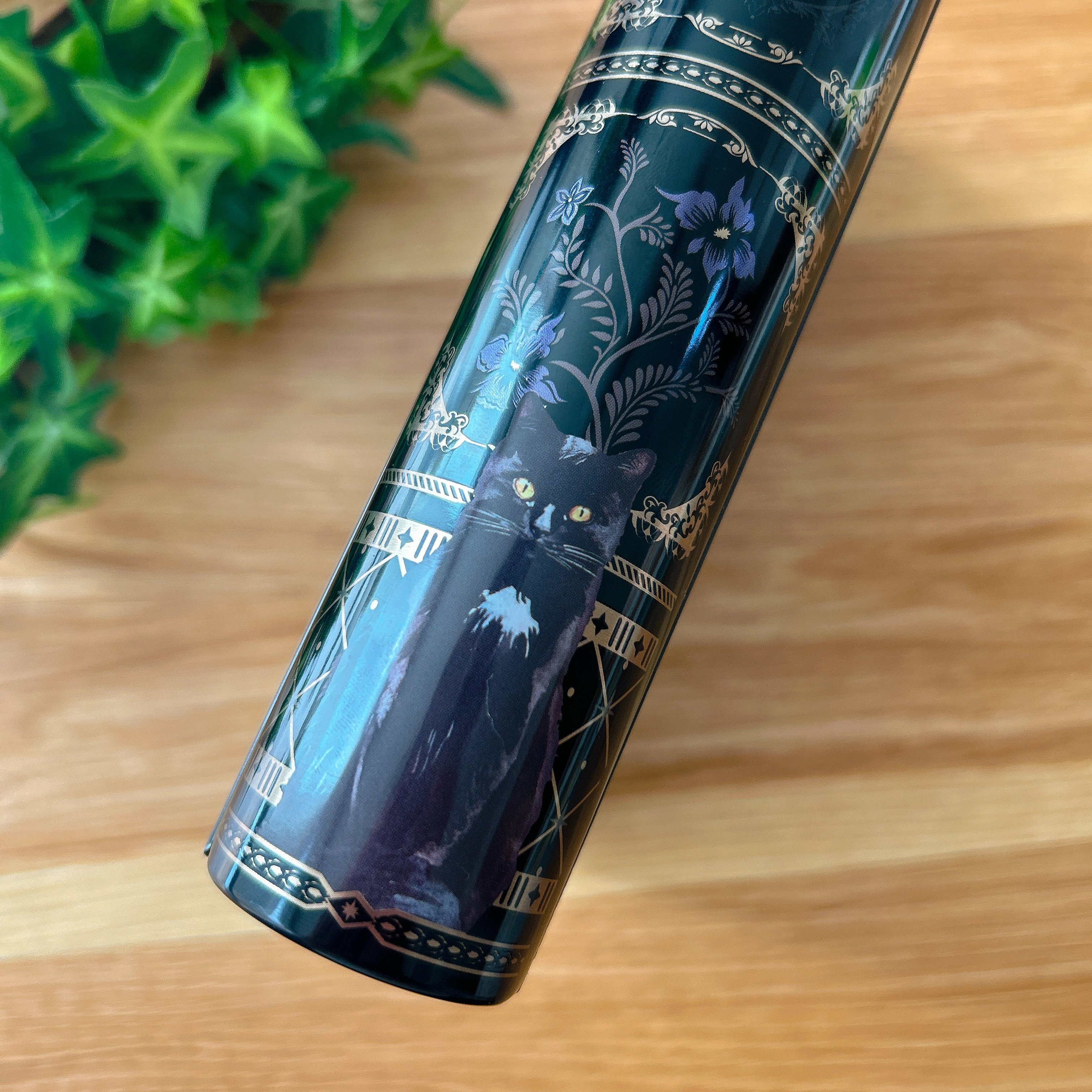 そして裏面には黒猫と背を向けたフクロウの姿が!缶はブラック色を基調としているため、闇の雰囲気にハロウィンらしさを感じさせます。
