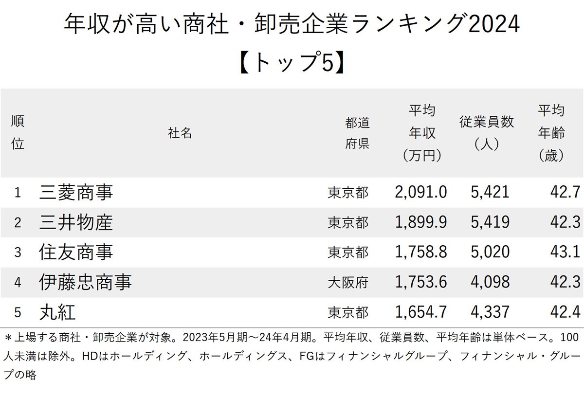 上位5位を、大手商社が占める結果となりました。上位3社は従業員数5000人以上、4位と5位も4000人以上と、いずれも非常に大きな会社です。「年収が高い商社・卸売企業ランキング」は過去に2023年度版と2022年度版も掲載していますが、順番の入れ替えはあるものの、この5社の顔ぶれは3年連続で変わっていません。
