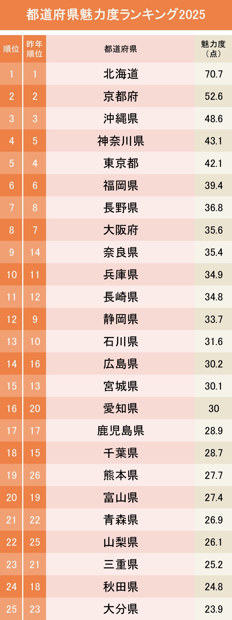 都道府県魅力度ランキング2025【47都道府県・完全版】 ブランド総合研究所 西嶋治美: フリーライター ダイヤモンド・ライフ編集部 ライフスタイル日本全国ご当地ランキング 2025年10月4日 22:57 記事をクリップ URLをコピー 記事を印刷 Xでシェア Facebookでシェア はてなブックマークでシェア LINEでシェア noteでシェア 拡大画像表 次のページ 「都道府県魅力度ランキング」26位~47位はこちら! 1 2 3 4 5 記事をクリップ URLをコピー 記事を印刷 Xでシェア Facebookでシェア はてなブックマークでシェア LINEでシェア noteでシェア 有料会員限定機能です詳細はこちら おすすめの会員限定記事 絶対に採用しないで!面接で「40代から成長しなくなる人」を一発で見抜く魔法の質問〈2025年度上期・会員ベスト2〉 エコノミークラスでも大丈夫!「空港ラウンジ」を使い倒す4つの裏技〈再配信〉 関連記事 都道府県魅力度ランキング2024【47都道府県・完全版】 ブランド総合研究所,西嶋治美,ダイヤモンド・ライフ編集部 市区町村魅力度ランキング2024【完全版】 ブランド総合研究所,西嶋治美,ダイヤモンド・ライフ編集部 「消滅しない」都道府県ランキング2024【47都道府県・完全版】 ブランド総合研究所,西嶋治美,ダイヤモンド・ライフ編集部 都道府県「幸福度」ランキング2024【47都道府県・完全版】 ブランド総合研究所,西嶋治美,ダイヤモンド・ライフ編集部 特集 あなたにおすすめ