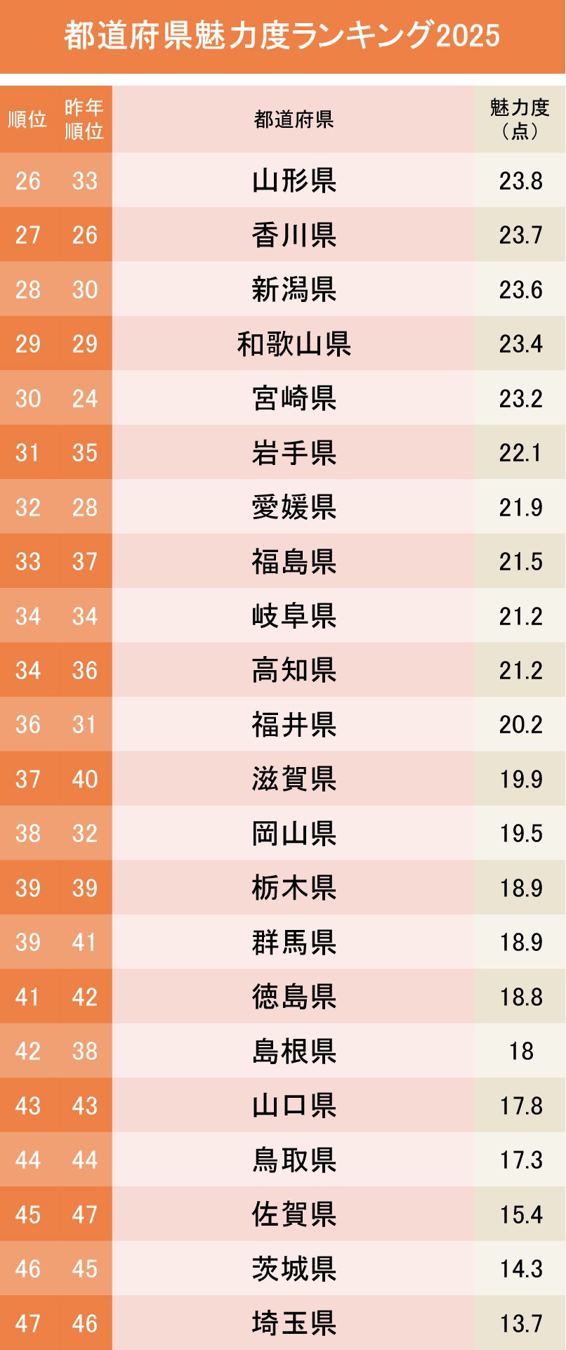 都道府県魅力度ランキング2025【47都道府県・完全版】 ブランド総合研究所 西嶋治美: フリーライター ダイヤモンド・ライフ編集部 ライフスタイル日本全国ご当地ランキング 2025年10月4日 22:57 記事をクリップ URLをコピー 記事を印刷 Xでシェア Facebookでシェア はてなブックマークでシェア LINEでシェア noteでシェア 拡大画像表示 次のページ 躍進した九州と東北の県 1 2 3 4 5 記事をクリップ URLをコピー 記事を印刷 Xでシェア Facebookでシェア はてなブックマークでシェア LINEでシェア noteでシェア 有料会員限定機能です詳細はこちら おすすめの会員限定記事 従業員の不満投稿が多いブラック企業ランキング2025上半期【完全版】ワースト1位は超有名企業!日産、シャープ、山崎製パンは何位? 超富裕層があえて外食で「ファミレスに行く」深い理由とは? 関連記事 都道府県魅力度ランキング2024【47都道府県・完全版】 ブランド総合研究所,西嶋治美,ダイヤモンド・ライフ編集部 市区町村魅力度ランキング2024【完全版】 ブランド総合研究所,西嶋治美,ダイヤモンド・ライフ編集部 「消滅しない」都道府県ランキング2024【47都道府県・完全版】 ブランド総合研究所,西嶋治美,ダイヤモンド・ライフ編集部 都道府県「幸福度」ランキング2024【47都道府県・完全版】 ブランド総合研究所,西嶋治美,ダイヤモンド・ライフ編集部 特集 あなたにおすすめ