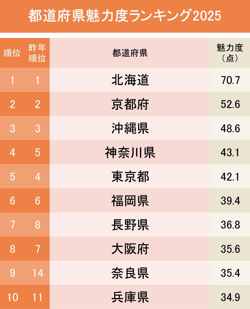 2025年の調査では20~30代で評価が上昇した一方、40代以上は横ばいにとどまり、世代間の認識の差が鮮明になった。上位常連の北海道、京都府、沖縄県の伸び率が伸び悩むなか、神奈川県や奈良県などの躍進が象徴的である。今後も、各地域がどのように魅力を発信していくのか、引き続き注目していきたい。