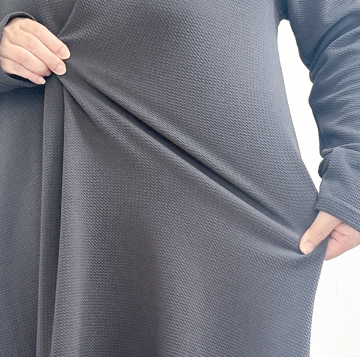 表面はデコボコしたエンボス加工がされていて、サラッとした軽い肌触り。柔らかくてストレッチ性があるから、スウェットやジャージみたいに動きやすいんです。