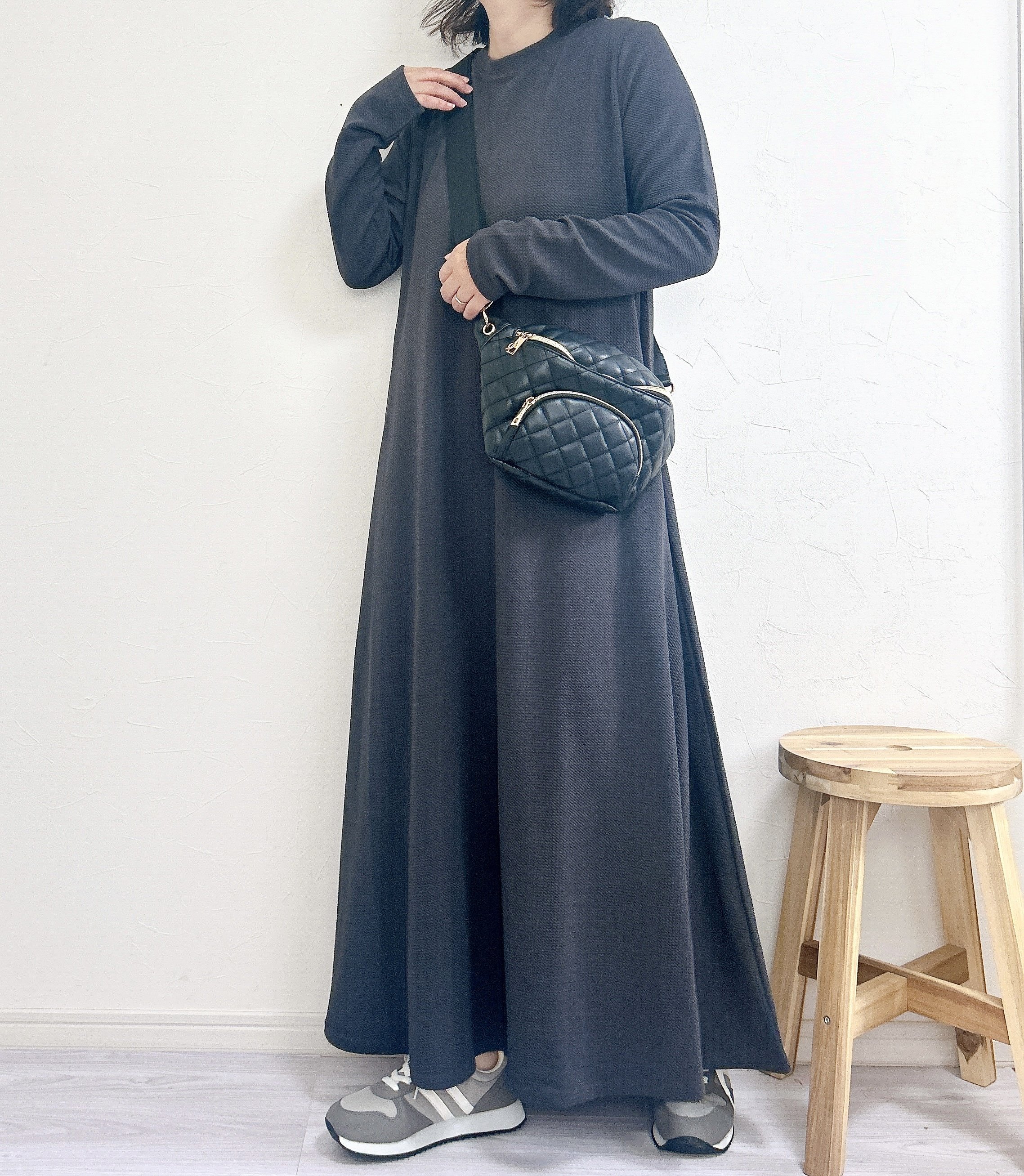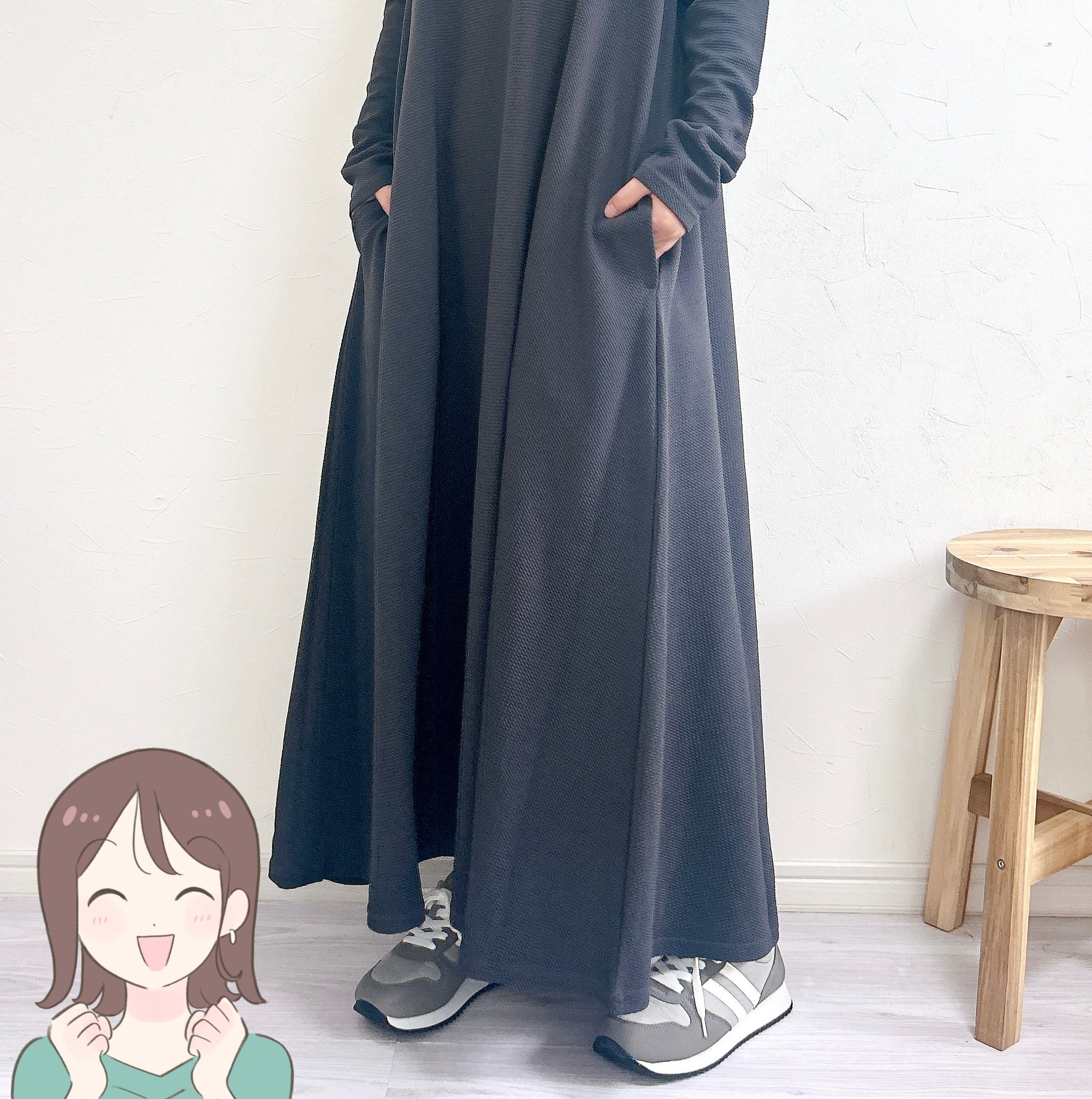 カジュアルにもきれいめにも使えるワンピースで、幅広いコーデに大活躍してくれます。スニーカーを合わせて、カジュアルダウンさせるとバランス良く決まってかわいいです!