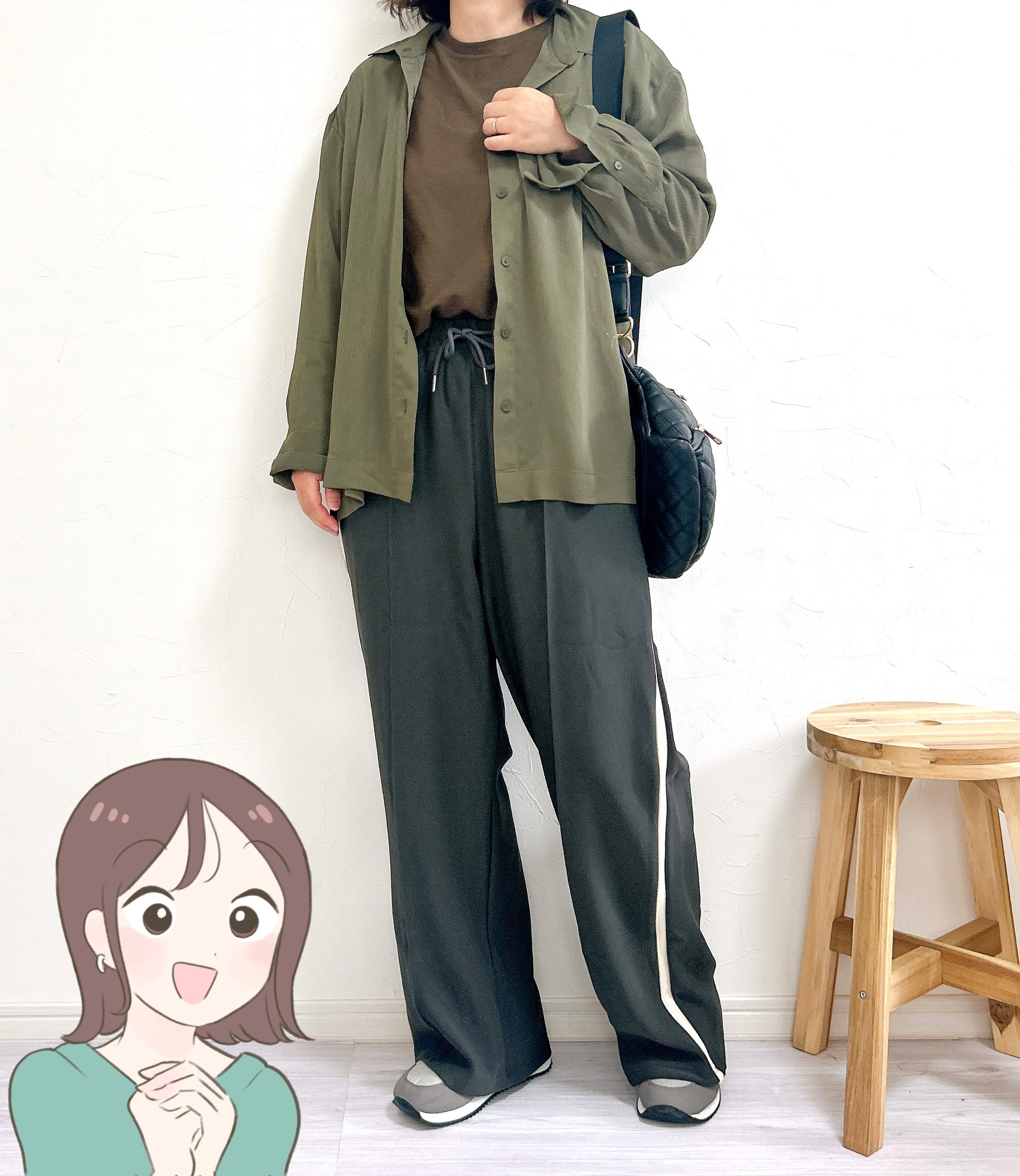シンプルなデザインだからどんなトップスにも合わせやすいのが魅力。とろみ感のあるシャツを合わせると、大人カジュアルのラフなスタイルが楽しめますよ。