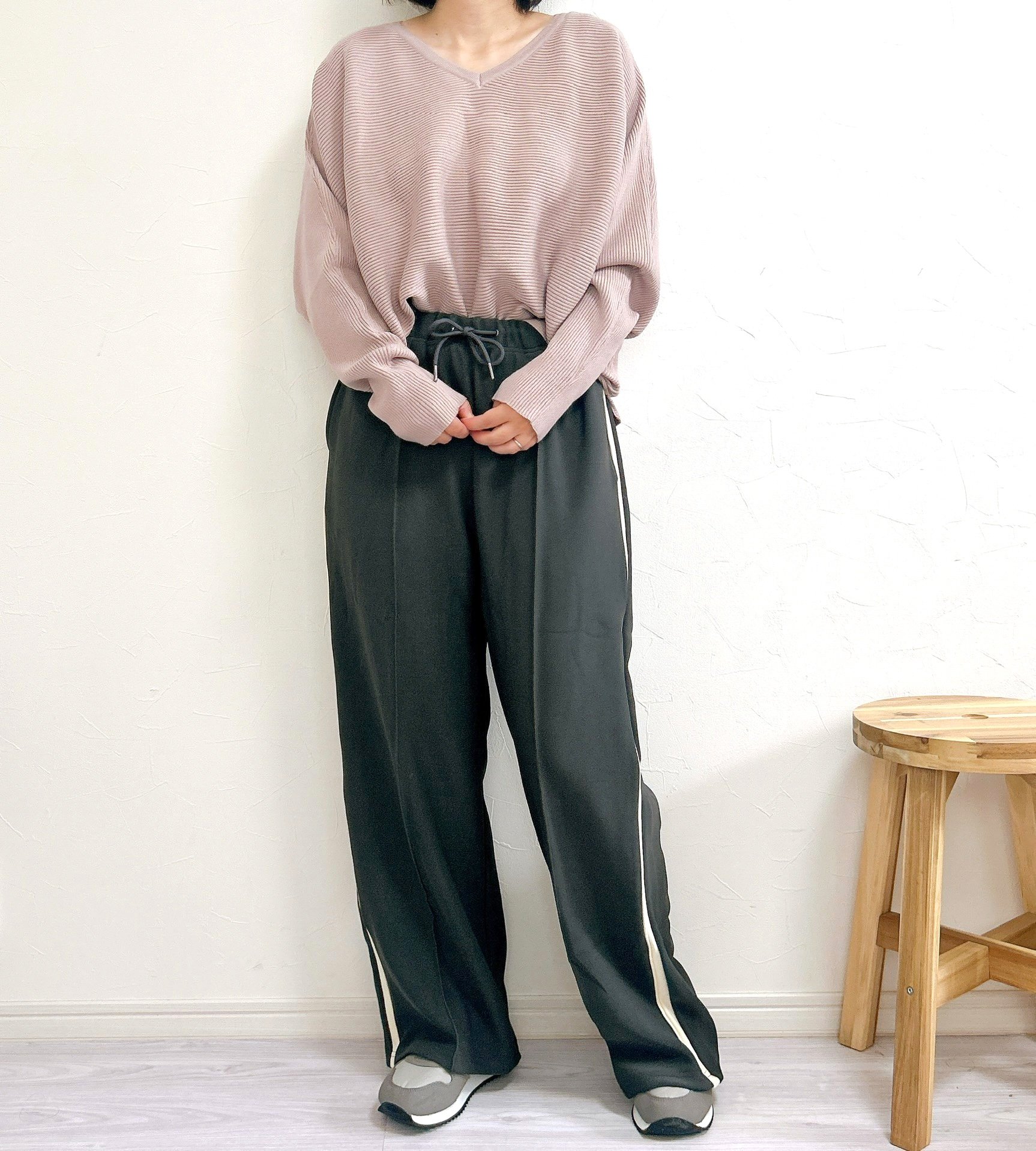 ラインデザインのおかげで、ニットなどのゆるっとしたトップスと合わせてもスッキリした着こなしに!