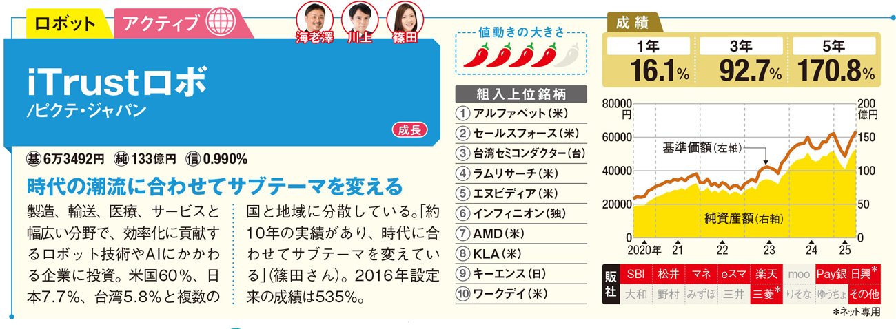 「iTrustロボ」は、製造、輸送、医療、サービスと幅広い分野で、効率化に貢献するロボット技術やAIにかかわる企業に投資。米国60%、日本7.7%、台湾5.8%と、複数の国と地域に分散している。特徴的なのは「約10年の実績があり、時代に合わせてサブテーマを変えていること」(篠田さん)。2016年設定来の成績は、なんと535%にも達している。