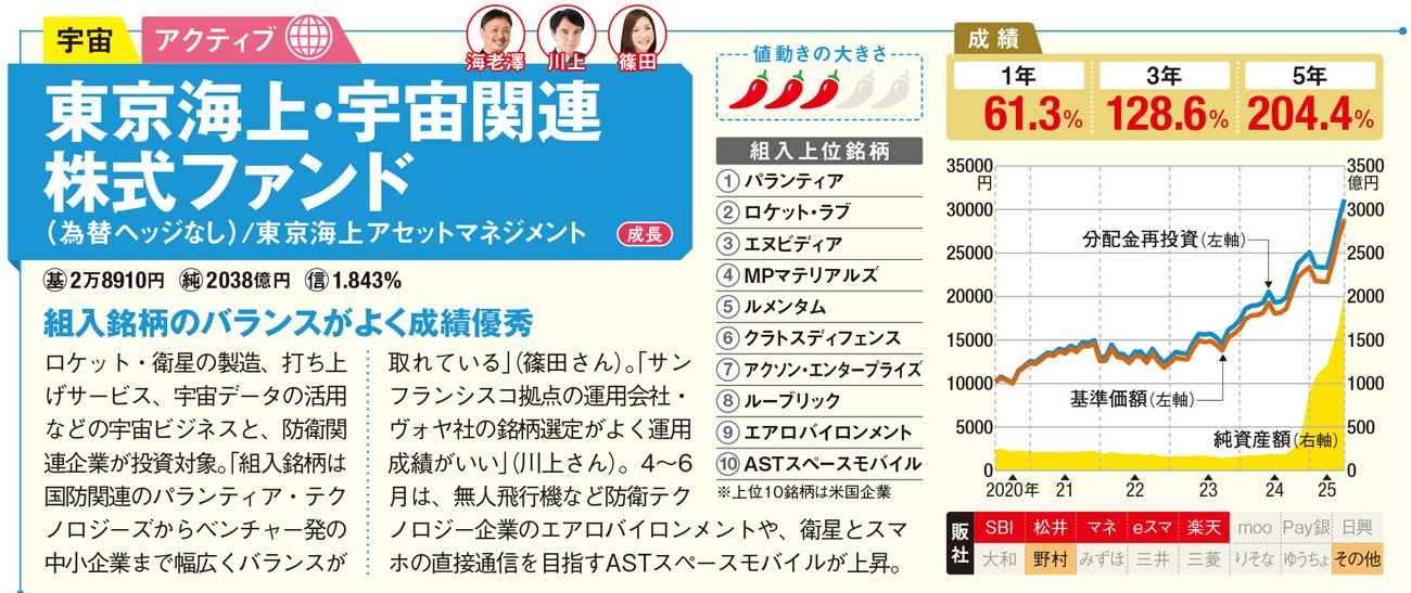 「東京海上・宇宙関連株式ファンド(為替ヘッジなし)」は、ロケット・衛星の製造、打ち上げサービス、宇宙データの活用などの宇宙ビジネスと、防衛関連企業が投資対象。「組入銘柄は国防関連のパランティア・テクノロジーズからベンチャー発の中小企業まで幅広くバランスが取れている」(篠田さん)。「サンフランシスコ拠点の運用会社・ヴォヤ社の銘柄選定がよく、運用成績がいい」(川上さん)。4~6月は、無人飛行機など防衛テクノロジー企業のエアロバイロンメントや、衛星とスマホの直接通信を目指すASTスペースモバイルが上昇。短期でも長期でもバツグンの成績を残している。