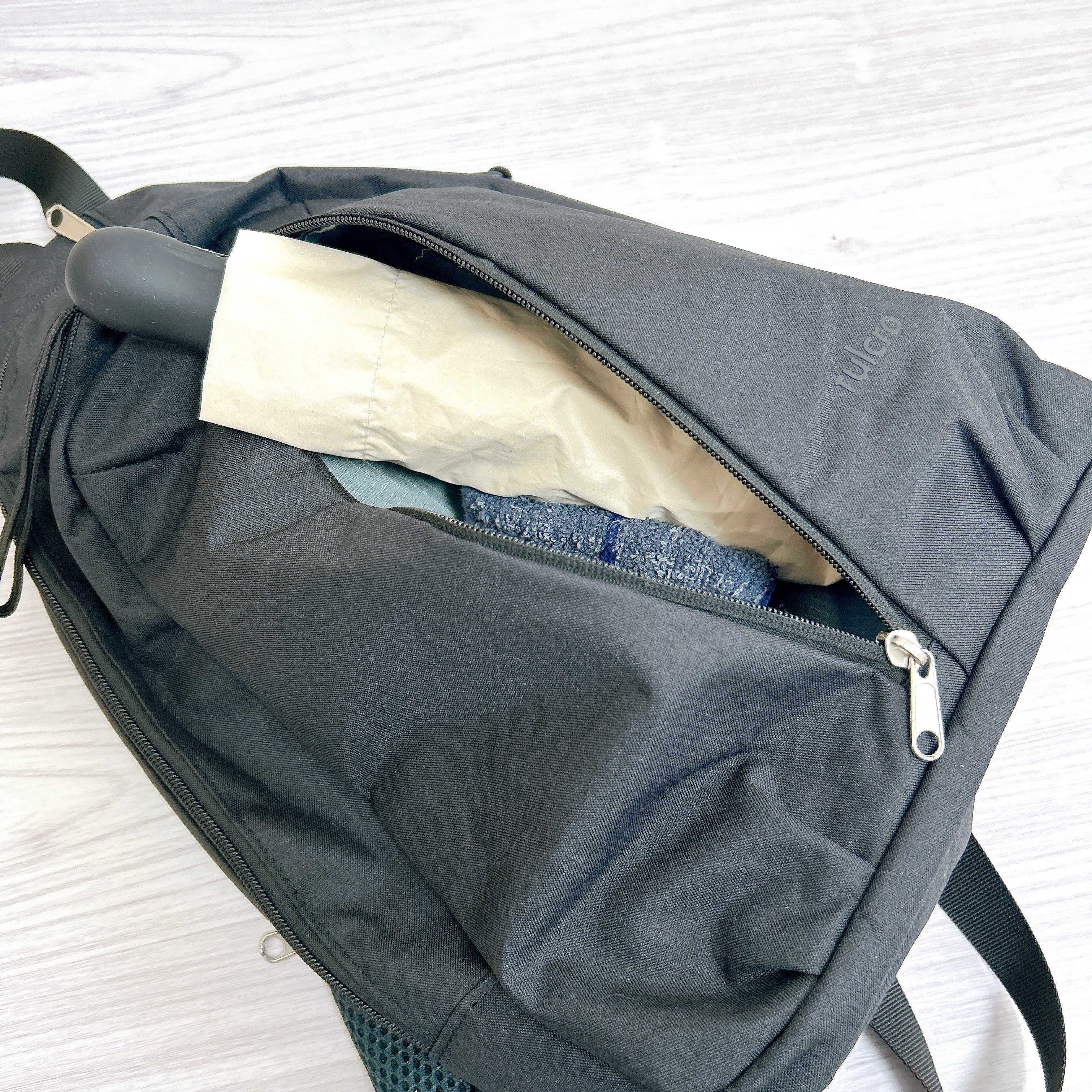 まず目につくのが、表面にある大きなフロントポケット。上から下までファスナーが続いていて、ガバッと大きく開くことができます。ハンカチなどの小物はもちろん、折りたたみ傘も入るくらいの収納力!