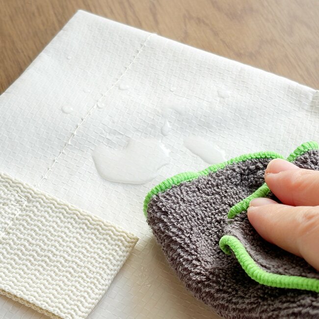 生地はポリプロピレン素材でツルツルした手触り。防水仕様ではありませんが、水を弾くので軽い雨の日の外出に便利です。