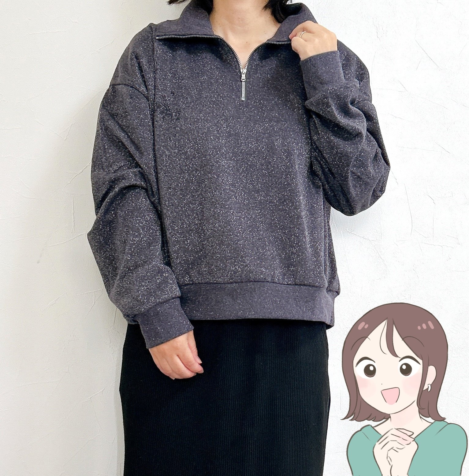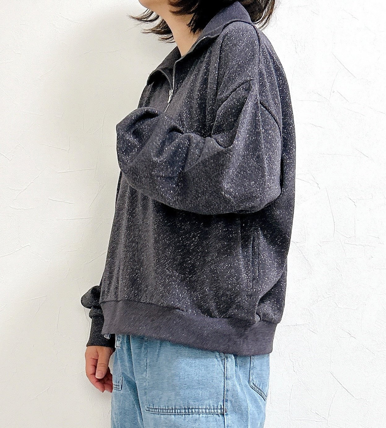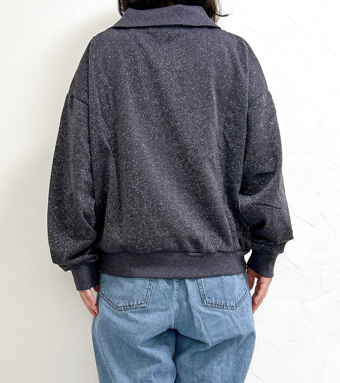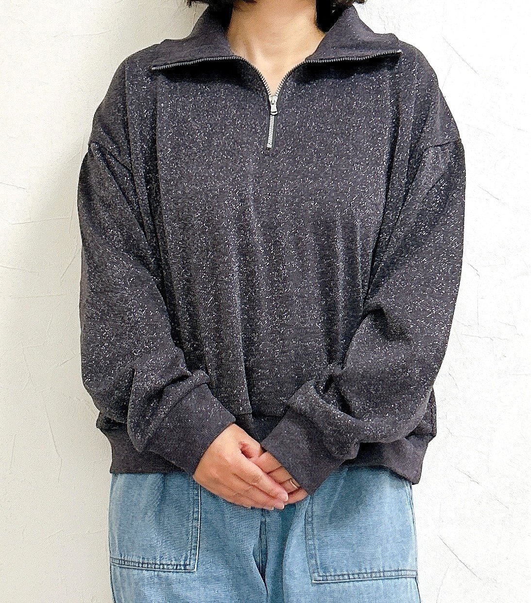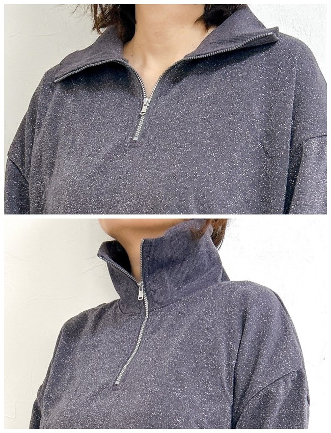 トレンドのハーフジップにラメが散りばめられた華やかなトップスです。スウェット風のラクな着心地に上品さが加わって、大人な雰囲気たっぷり。