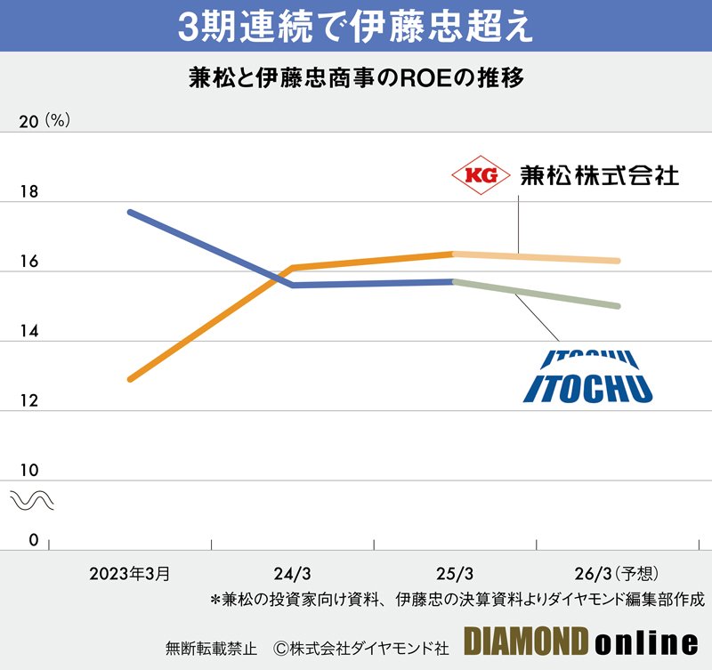 兼松は、足元ではICTと電子・デバイスの二つの部門で利益の6割を稼ぐ。ROE(株主資本利益率)はここ2年で16%と、非資源商社ナンバーワンを掲げる伊藤忠商事をも上回る(下表参照)。