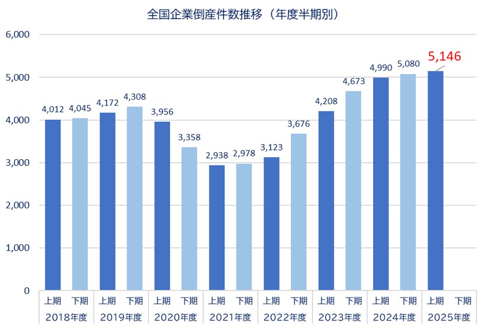 帝国データバンクは10月8日に全国企業倒産集計(負債1000万円以上、法的整理を対象)を発表。2025年度上半期(2025年4月~9月)の倒産件数は、前年同期から3.1%増(156件)の5146件となり、年度上半期として12年ぶりに5000件を超えた。