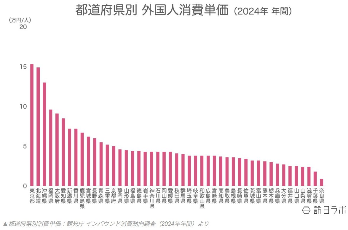 外国人訪問者数だと京都府は974.5万人で、都道府県別ランキング4位であるにもかかわらずだ。つまり、京都に外国人はたくさん来るが、現地におカネを落としていない。一方で、消費単価ランキング上位は、宿泊を伴う地であることは想像に容易い。