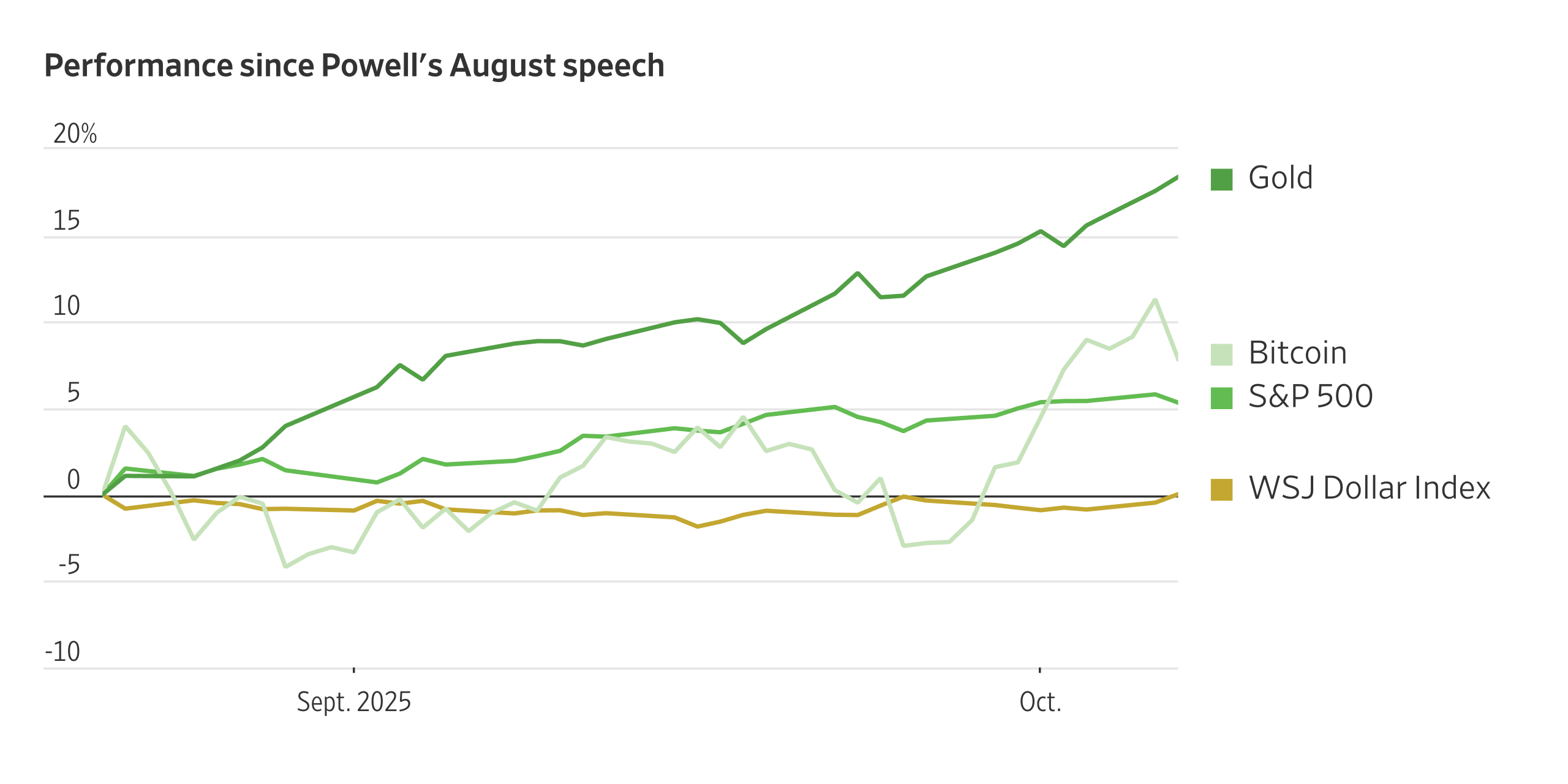 米ドルなど主要通貨の今後を懸念する投資家は、金やビットコインおよびその他の代替資産に殺到している。これが、ウォール街で「ディベースメント・トレード」(通貨価値下落に備えた売買)と呼ばれる取引を支えている。米連邦準備制度理事会(FRB)のジェローム・パウエル議長は8月、失業率が低くインフレ率が目標を上回っているにもかかわらず利下げ開始を示唆した。トレーダーは以降、金を買い進め、価格を過去最高水準まで押し上げた。7日の金先物(中心限月)は初めて1トロイオンス=4000ドルを突破した。2025年の金上昇が異例なのは、それが金融危機によって引き起こされたものではないことだ。金先物は今年52%上昇しており、新型コロナウイルスのパンデミック(世界的大流行)の初年度や、2007年から2009年の景気後退(リセッション)時に見られた金急騰を上回る見通し。これは、1979年のインフレショックに次ぐ水準だ。