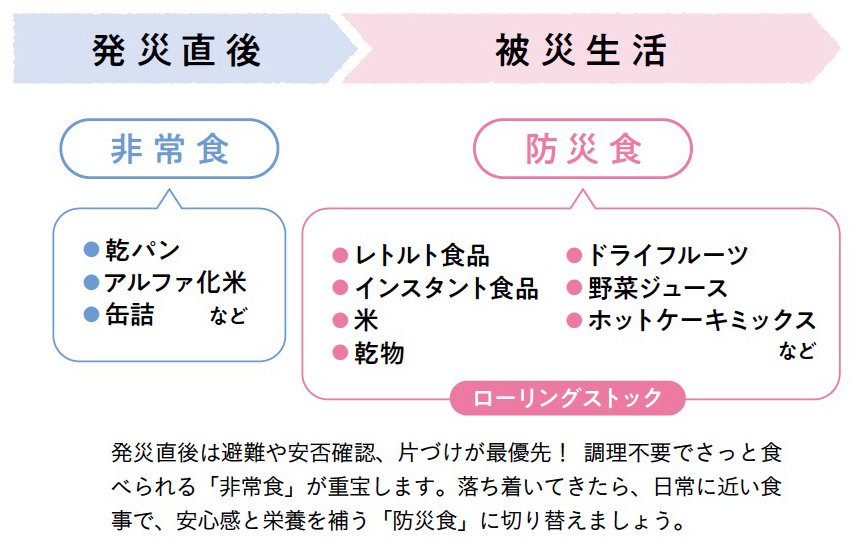 発災直後は避難や安否確認、片づけが最優先!調理不要でさっと食べられる「非常食」が重宝します。落ち着いてきたら、日常に近い食事で、安心感と栄養を補う「防災食」に切り替えましょう。