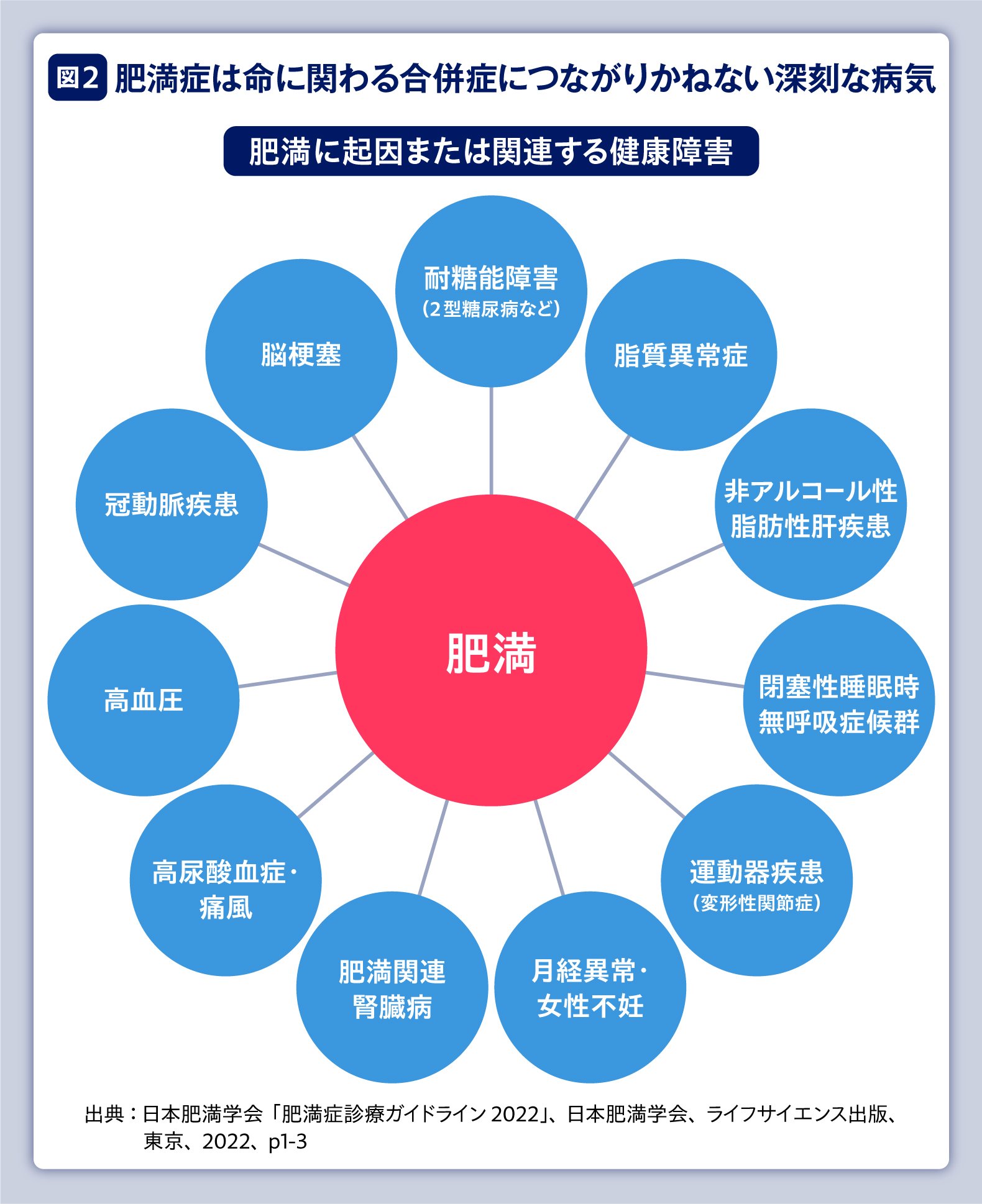 これまでの研究から、肥満症は重大な慢性疾患の一つであることが明らかになっている(*2)。どんなに食事制限や運動をしても、十分な効果を得られない人が多いのは、遺伝的要因を含む数多くの要因が関係し、診断と治療が必要な医学的疾患だからだ。