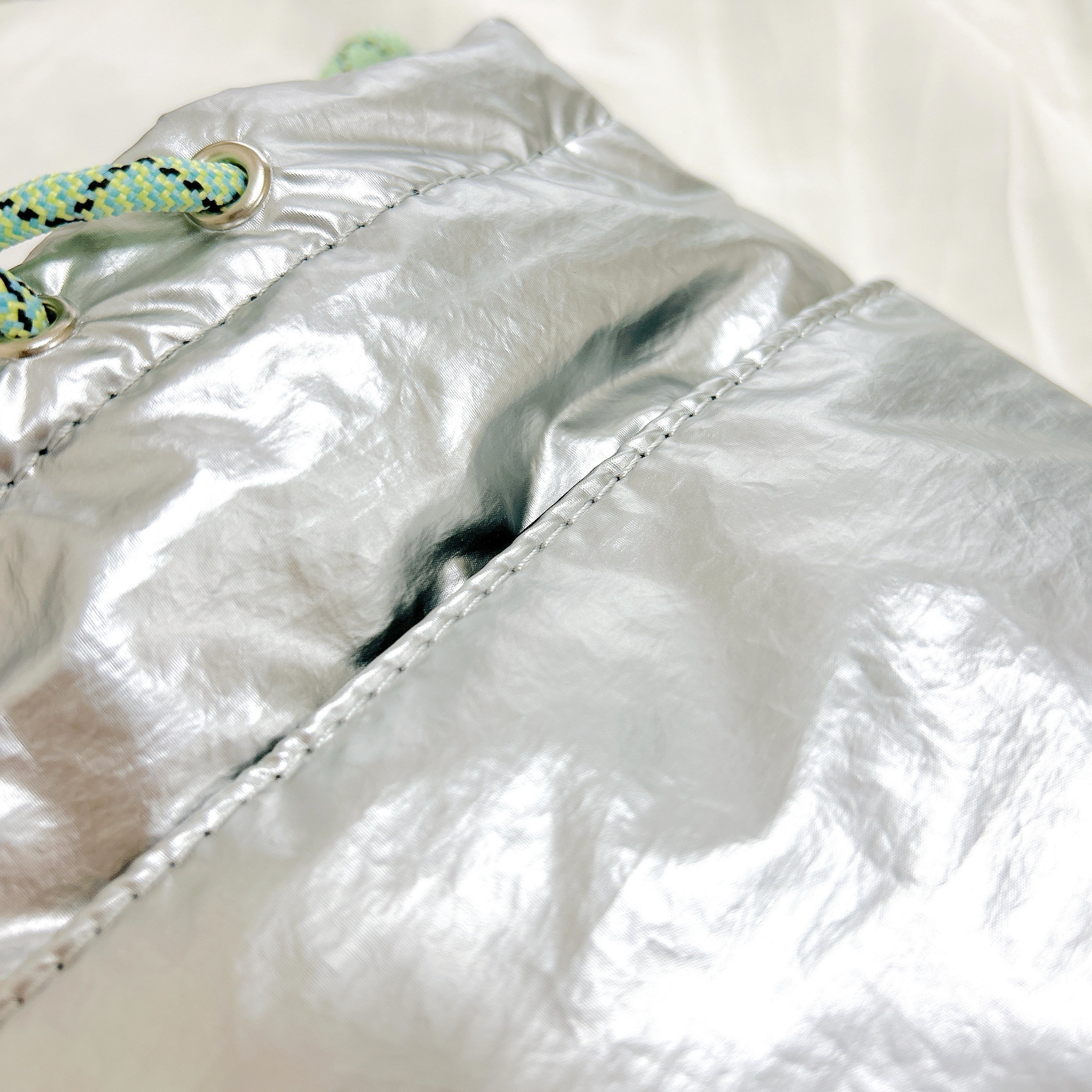 カラーによって素材が異なるようで、選んだシルバーは光沢感のあるシャカシャカとした触り心地。