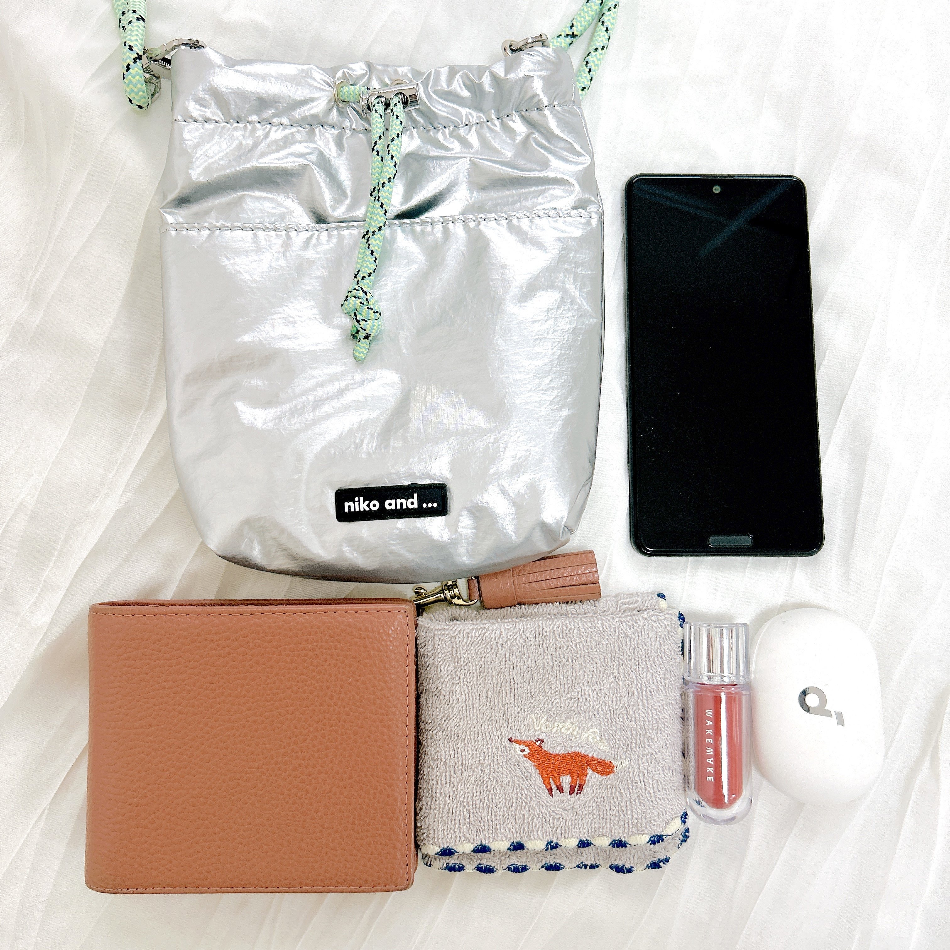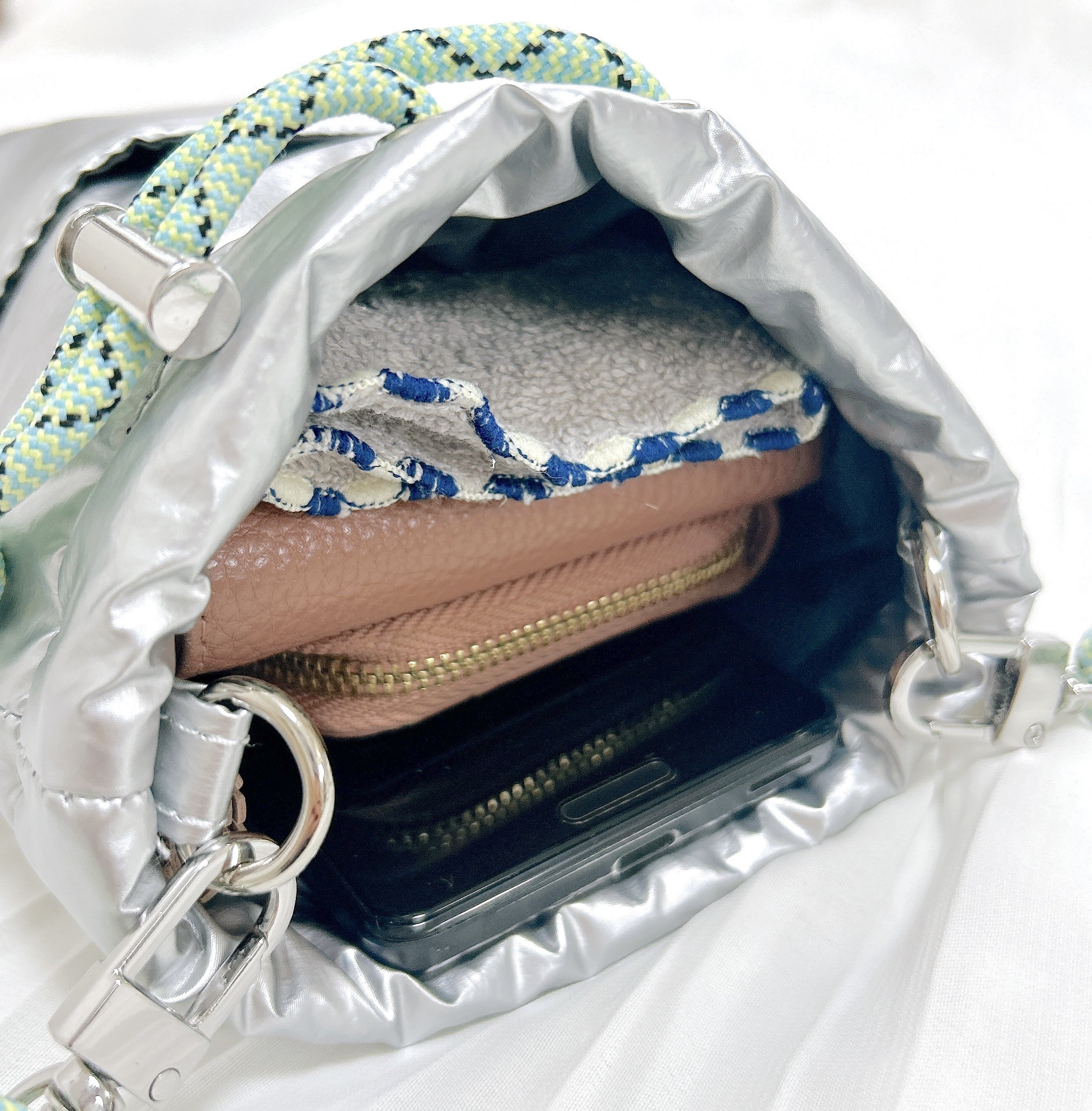 サイズは(約)高さ18.5×幅13×マチ1cmです。メインスペースは、スマホ、二つ折り財布、ハンカチでいっぱいになりました。開け口はドローコードでギュッと結ぶため、荷物が溢れないようになっています。