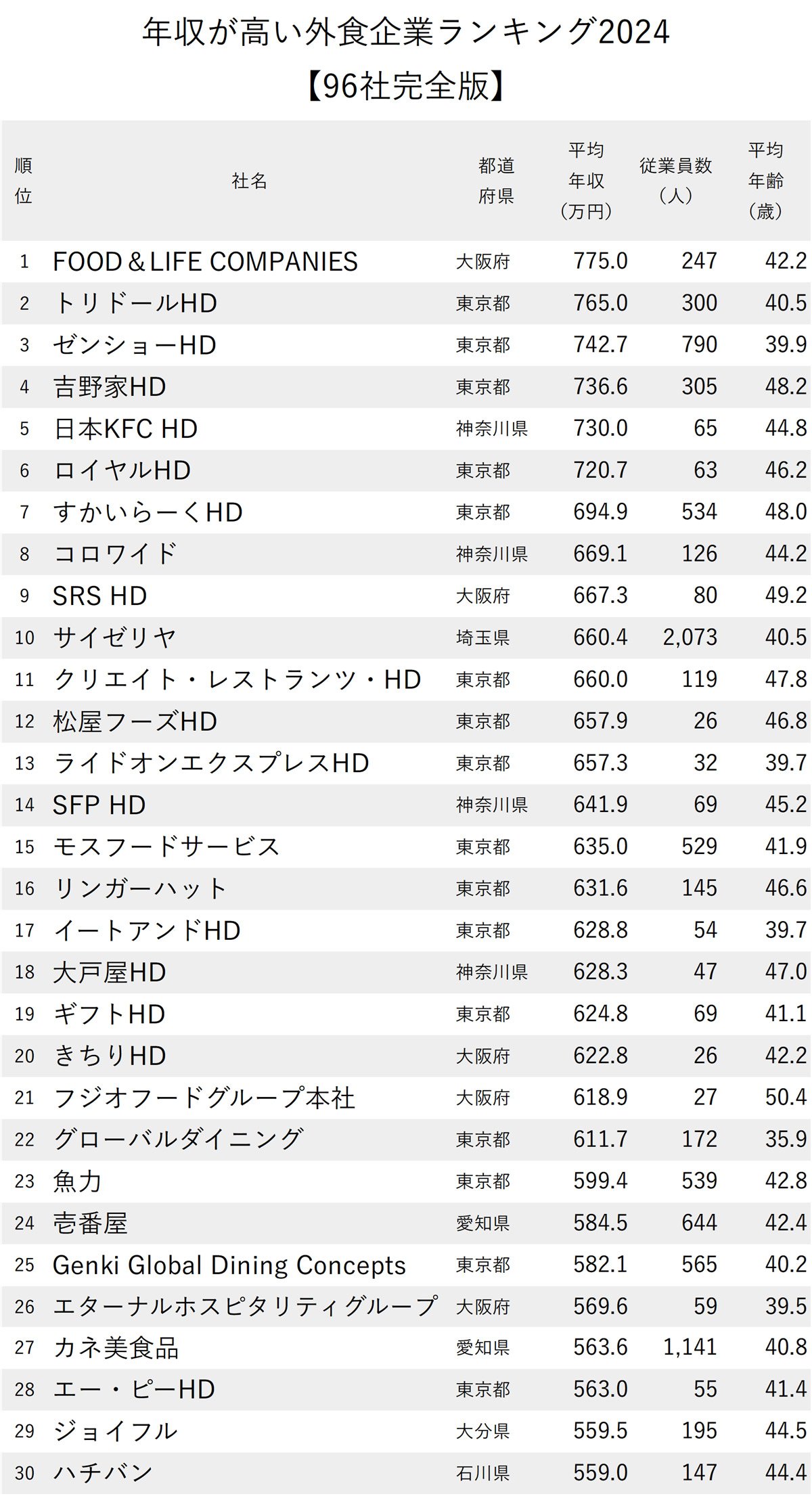 年収が高い外食企業ランキング2024【96社完全版】スシロー・くら寿司・はま寿司の年収序列は? ダイヤモンド・ライフ編集部 マネー・投資ニッポンなんでもランキング! 2025年10月13日 6:00 記事をクリップ URLをコピー 記事を印刷 Xでシェア Facebookでシェア はてなブックマークでシェア LINEでシェア noteでシェア 拡大画像表示 次のページ 31位から60位はこちら 1 2 3 4 5 [{:code=>"10174511", :name=>"日本マクドナルドホールディングス"}, {:code=>"10101263", :name=>"ワタミ"}, {:code=>"10083087", :name=>"吉野家ホールディングス"}, {:code=>"10139619", :name=>"ロイヤルホールディングス"}, {:code=>"10139813", :name=>"リンガーハット"}, {:code=>"10140102", :name=>"松屋フーズ"}, {:code=>"10371120", :name=>"鳥貴族"}, {:code=>"10187699", :name=>"コロワイド"}, {:code=>"10275644", :name=>"ペッパーフードサービス"}] この記事に関連する企業 日本マクドナルドホールディングス ワタミ 吉野家ホールディングス ロイヤルホールディングス リンガーハット 松屋フーズ 鳥貴族 コロワイド ペッパーフードサービス 記事をクリップ URLをコピー 記事を印刷 Xでシェア Facebookでシェア はてなブックマークでシェア LINEでシェア noteでシェア 有料会員限定機能です詳細はこちら おすすめの会員限定記事 メールで「~してください」を「~して下さい」と漢字で書く人たちの共通点〈見逃し配信〉 エコノミークラスでも大丈夫!「空港ラウンジ」を使い倒す4つの裏技〈再配信〉 関連記事 「食べ放題で元を取る人」のメニュー選びに共通する“たった1つの基準”とは?【グルメ専門家が解説】 東龍 ワインを飲んで語る男性、「この人、分かってないな…」と即バレするひとこと 今村佳奈 【美人ソムリエが教える】ワインの「知ったかぶり」が一発でバレるNGワードとは? 今村佳奈 なぜ東京は世界一の美食都市なのか?掲載数526軒のミシュランガイド「4つの不思議」 東龍 特集 あなたにおすすめ