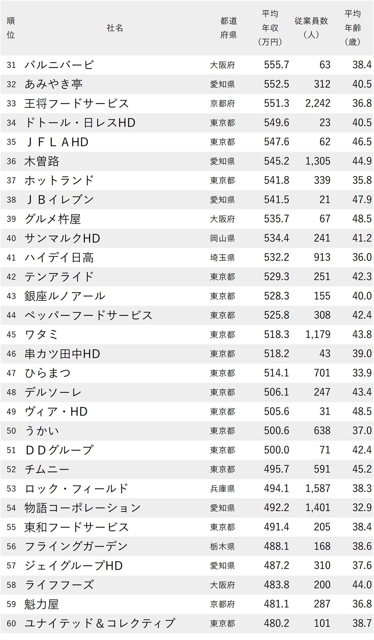 年収が高い外食企業ランキング2024【96社完全版】スシロー・くら寿司・はま寿司の年収序列は? ダイヤモンド・ライフ編集部 マネー・投資ニッポンなんでもランキング! 2025年10月13日 6:00 記事をクリップ URLをコピー 記事を印刷 Xでシェア Facebookでシェア はてなブックマークでシェア LINEでシェア noteでシェア 拡大画像表示 次のページ 61位から96位はこちら 1 2 3 4 5 [{:code=>"10174511", :name=>"日本マクドナルドホールディングス"}, {:code=>"10101263", :name=>"ワタミ"}, {:code=>"10083087", :name=>"吉野家ホールディングス"}, {:code=>"10139619", :name=>"ロイヤルホールディングス"}, {:code=>"10139813", :name=>"リンガーハット"}, {:code=>"10140102", :name=>"松屋フーズ"}, {:code=>"10371120", :name=>"鳥貴族"}, {:code=>"10187699", :name=>"コロワイド"}, {:code=>"10275644", :name=>"ペッパーフードサービス"}] この記事に関連する企業 日本マクドナルドホールディングス ワタミ 吉野家ホールディングス ロイヤルホールディングス リンガーハット 松屋フーズ 鳥貴族 コロワイド ペッパーフードサービス 記事をクリップ URLをコピー 記事を印刷 Xでシェア Facebookでシェア はてなブックマークでシェア LINEでシェア noteでシェア 有料会員限定機能です詳細はこちら おすすめの会員限定記事 絶対に採用しないで!面接で「40代から成長しなくなる人」を一発で見抜く魔法の質問〈2025年度上期・会員ベスト2〉 40代タイミーおじさんが「正直もう働きたくない」天丼チェーン店のあきれた実態 関連記事 「食べ放題で元を取る人」のメニュー選びに共通する“たった1つの基準”とは?【グルメ専門家が解説】 東龍 ワインを飲んで語る男性、「この人、分かってないな…」と即バレするひとこと 今村佳奈 【美人ソムリエが教える】ワインの「知ったかぶり」が一発でバレるNGワードとは? 今村佳奈 なぜ東京は世界一の美食都市なのか?掲載数526軒のミシュランガイド「4つの不思議」 東龍 特集 あなたにおすすめ