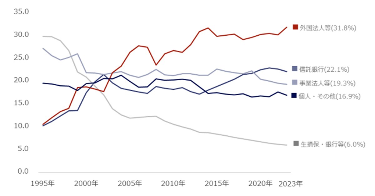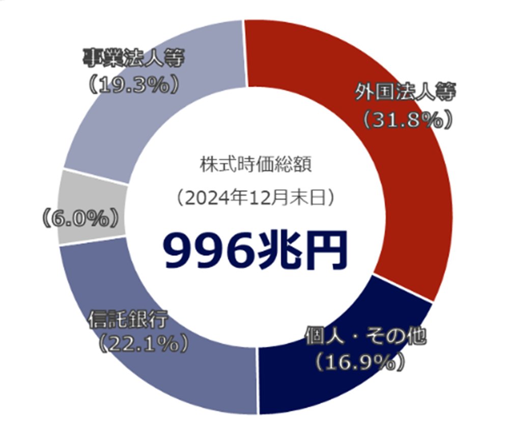 24年末時点で日本の上場企業の株式時価総額は、約996兆円。そのうち外国法人の割合は、31.8%にまで高まっている。1995年には約10%しかなかったのに。実のところ、海外機関投資家への偏りに抵抗感のある企業も多いものと思われる。