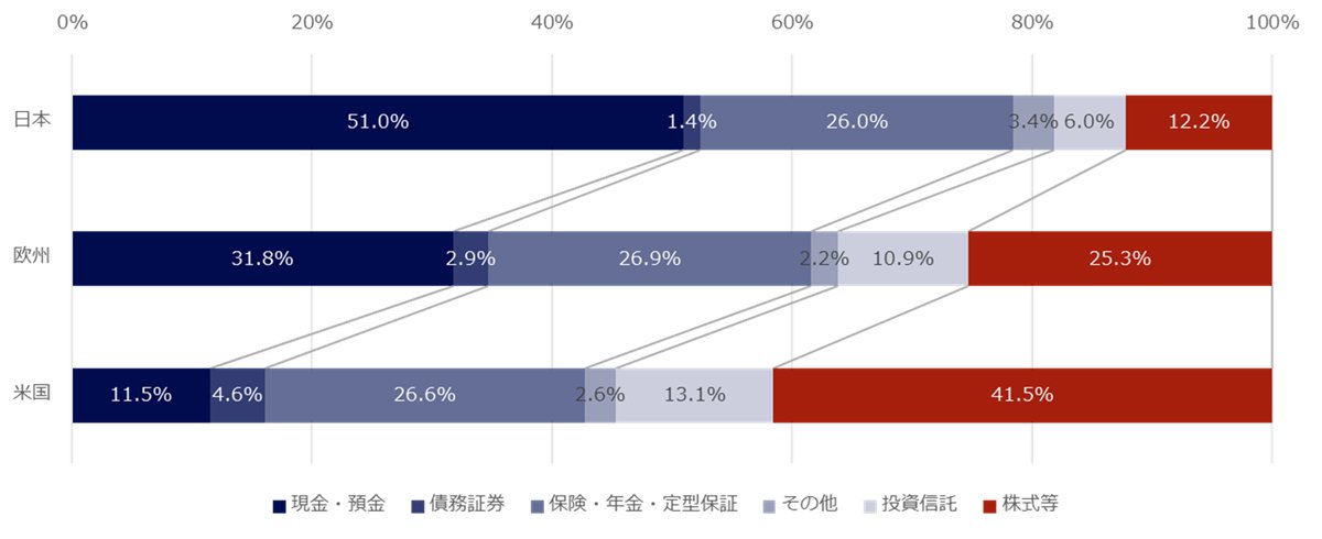 下のグラフを見てほしい。「現金・預金」の割合は、日本が51.0%もあるのに対して、米国は11.5%。一方、「投資信託」と「株式等」を合わせた割合は、日本が18.2%、米国は54.6%と3倍もの開きがある。S&P500の大きな上昇には株式市場へのリスク資金の供給力の差が挙げられる。