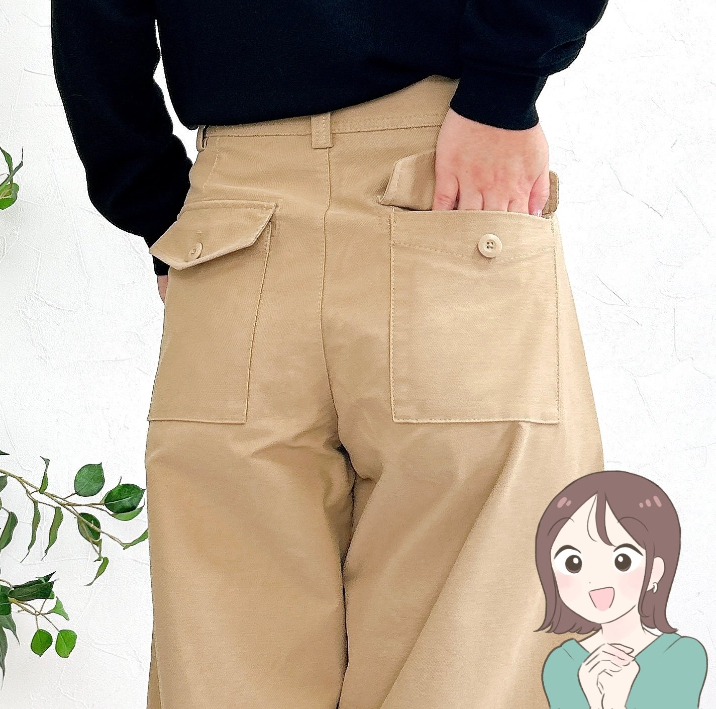 お尻側にはフラップ付きのパッチポケットがあってかわいい!お尻のラインも目立たず嬉しいです。大きめサイズだったので、こちらにスマホを入れた方が歩きやすかったですよ。