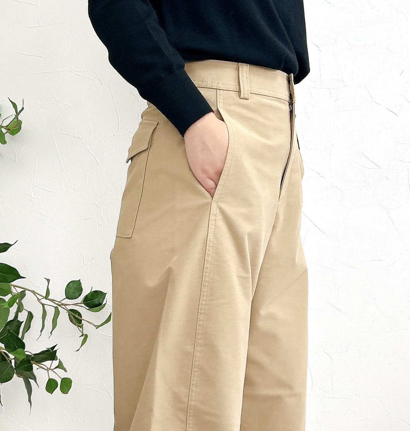 見た目はチノパンのようにしっかりとハリ感がありますが、なめらかなコットンブレンドジャージー素材を使用しているため肌当たりが楽ちん!ほどよく伸縮性があって動きやすいです。