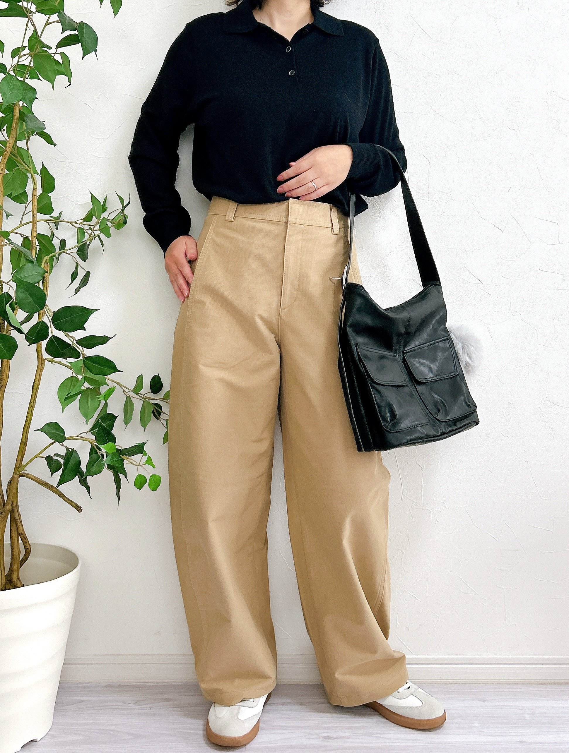 ボリュームのあるパンツのため、トップスはショート丈などのコンパクトなトップスと合わせるとより華奢見えしてしてくれます。薄手のニットとも好相性で秋の季節にも重宝しそう!