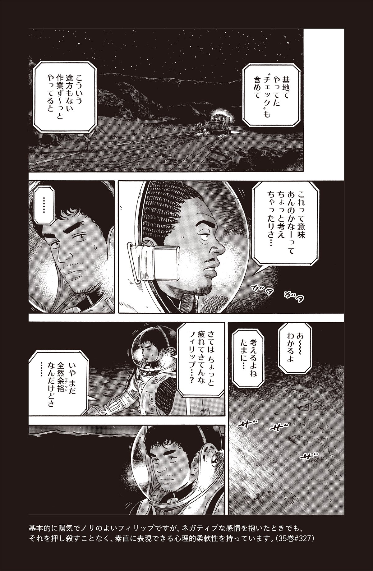 六太が所属する「ジョーカーズ」(編集部注/月面ミッションに選出された6名からなるチーム)のメンバーのひとりフィリップも、月面基地で六太に複雑な心境を吐露するシーンがありますね。地球への帰還の目途も立たない中、たったふたりで途方もない作業を続ける日々が続き、思わず「これって意味あんのかなーって、ちょっと考えちゃったりさ……」と、六太に打ち明けます。