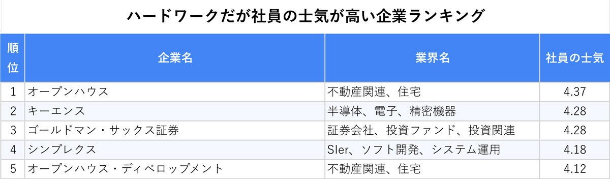 そこで今回は、直近3年間でOpenWorkに一定数の投稿がある企業を対象に、平均残業時間が法定外残業時間である月45時間を超え、かつOpenWork上の有給消化率平均(66%)を下回るにもかかわらず、「社員の士気」スコアが高い企業をランキング形式で紹介する。ハードワークをこなしながらも高い士気を維持している理由を探る。