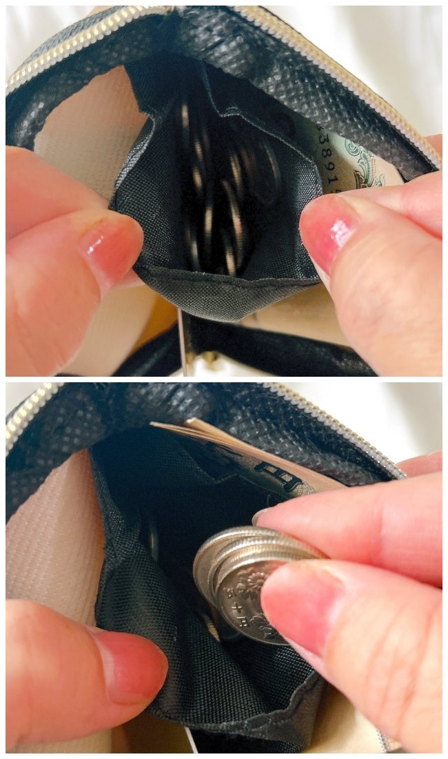 小銭を入れるスペースは小さいですが、財布が広がるから指がしっかり入って取り出せます。ただ奥まで見づらいため、小銭の量は多く入れすぎない方がよさそう。