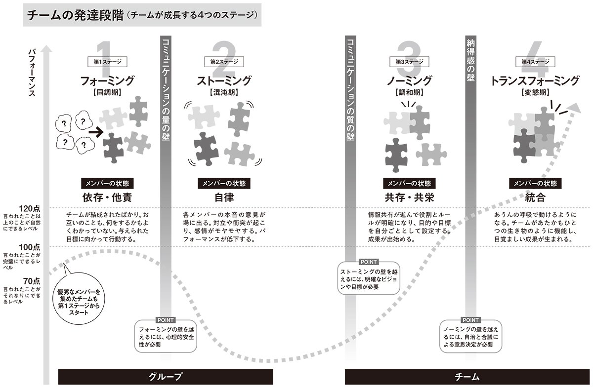 集団や組織は、「フォーミング」の状態から始まります(編集部注/すべてのチームは、第1ステージの「フォーミング(同調期)」から始まり、第2ステージの「ストーミング(混沌期)」を経て、第3ステージの「ノーミング(調和期)」、第4ステージの「トランスフォーミング(変態期)」へと成長していく)。