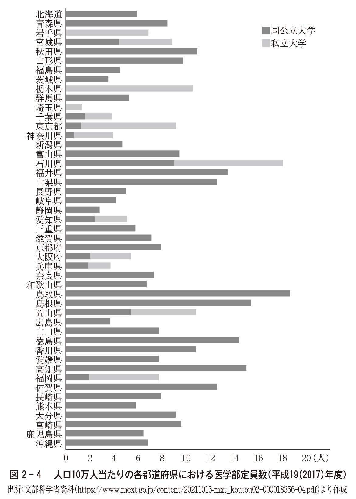 この表2-1を用いて、新設医科大学ができるまで医学部のなかった都道府県を確認してみると、北海道から滋賀県までの東日本で17県、京都以西の西日本では11県となっています。また、図2-4をよく見るとわかりますが、現在に至るまで岩手県、栃木県、埼玉県には、国公立大学の医学部は存在していません。このように、データから見ても、医師養成の西高東低が医療資源の西高東低に大きく結びついていることがわかります。