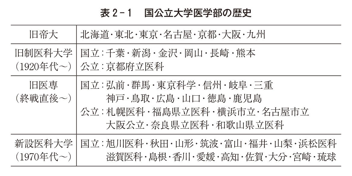 じつは、国立大学医学部の歴史を紐解くと、西日本のほうに多く国立大学医学部が設置されてきました。国立大学医学部の設置の歴史は、表2-1に示されているとおり、旧帝国大学に始まり、1920年代に旧制医科大学、終戦直後の1940年代に旧医学専門学校(旧医専)が大学化されました。