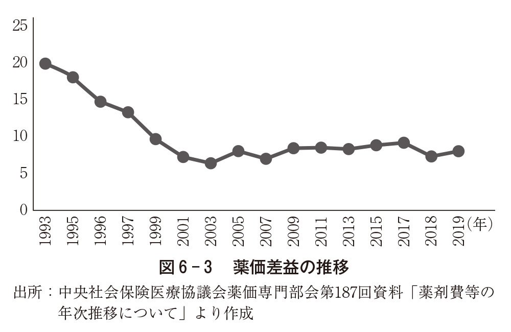 こうした薬価の引き下げ政策の結果、薬価差益は1990年代に大きく減少しました。図6-3は、薬価を100としたときの平均的な薬価差益の推移を表しています。1993年には約20あった薬価差益が、近年では8程度で推移しているのがわかります。上述した薬価差益を縮める政策の明確な効果を理解できます。
