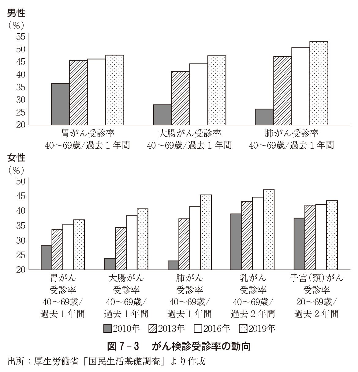 図7-3を用いて、近年のがん検診受診率の動向を確認していきましょう。図7-3は、2010年から2019年までの男女のがん検診受診率の動向を示しています。どのがん検診においても、男女とも増加しており、がん検診が着々と普及していることが理解できます。
