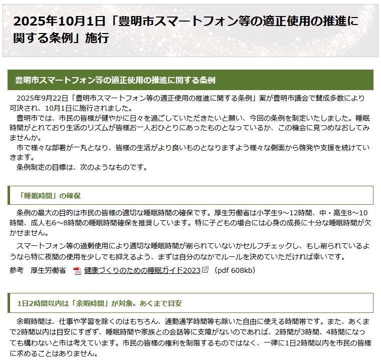 余暇時間に使うスマホの利用を1日2時間以内とする「豊明市スマートフォン等の適正使用の推進に関する条例」が10月1日、愛知県豊明市で施行された。強制力も罰則もないが、なかなか思い切った条例である。