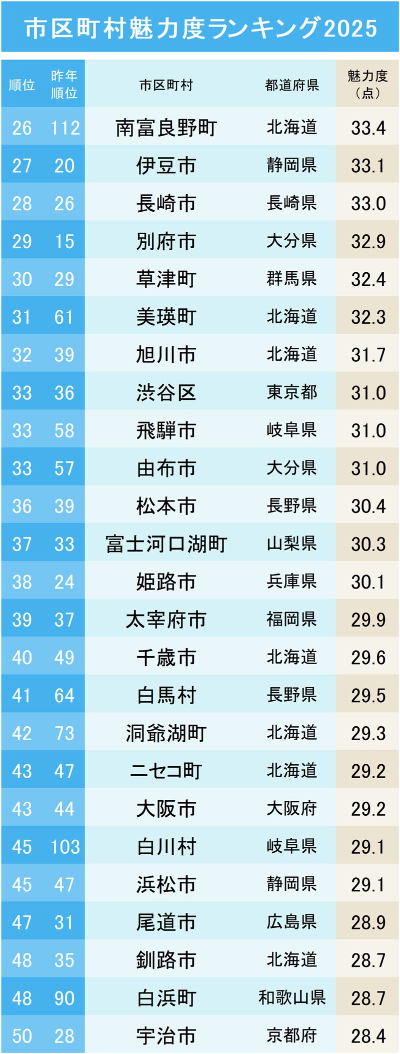 市区町村魅力度ランキング2025【完全版】 ブランド総合研究所 西嶋治美: フリーライター ダイヤモンド・ライフ編集部 社会日本全国ご当地ランキング 2025年10月22日 7:00 記事をクリップ URLをコピー 記事を印刷 Xでシェア Facebookでシェア はてなブックマークでシェア LINEでシェア noteでシェア 拡大画像表示 次のページ 北海道ブランドが細分化 1 2 3 4 5 記事をクリップ URLをコピー 記事を印刷 Xでシェア Facebookでシェア はてなブックマークでシェア LINEでシェア noteでシェア 有料会員限定機能です詳細はこちら おすすめの会員限定記事 エコノミークラスでも大丈夫!「空港ラウンジ」を使い倒す4つの裏技〈再配信〉 超富裕層があえて外食で「ファミレスに行く」深い理由とは? 関連記事 都道府県魅力度ランキング2025【47都道府県・完全版】 ブランド総合研究所,西嶋治美,ダイヤモンド・ライフ編集部 市区町村魅力度ランキング2024【完全版】 ブランド総合研究所,西嶋治美,ダイヤモンド・ライフ編集部 「消滅しない」都道府県ランキング2024【47都道府県・完全版】 ブランド総合研究所,西嶋治美,ダイヤモンド・ライフ編集部 都道府県「幸福度」ランキング2024【47都道府県・完全版】 ブランド総合研究所,西嶋治美,ダイヤモンド・ライフ編集部 特集 あなたにおすすめ