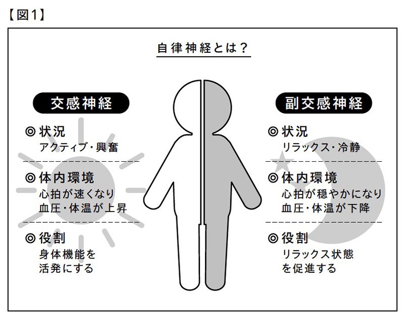 自律神経は無意識下で働いているので、知らず知らずのうちに消耗し、それが脳疲労へとつながっていくこともあります。交感神経と副交感神経で構成される自律神経は、両者のバランスをとることが非常に大事になります(【図1】参照)。