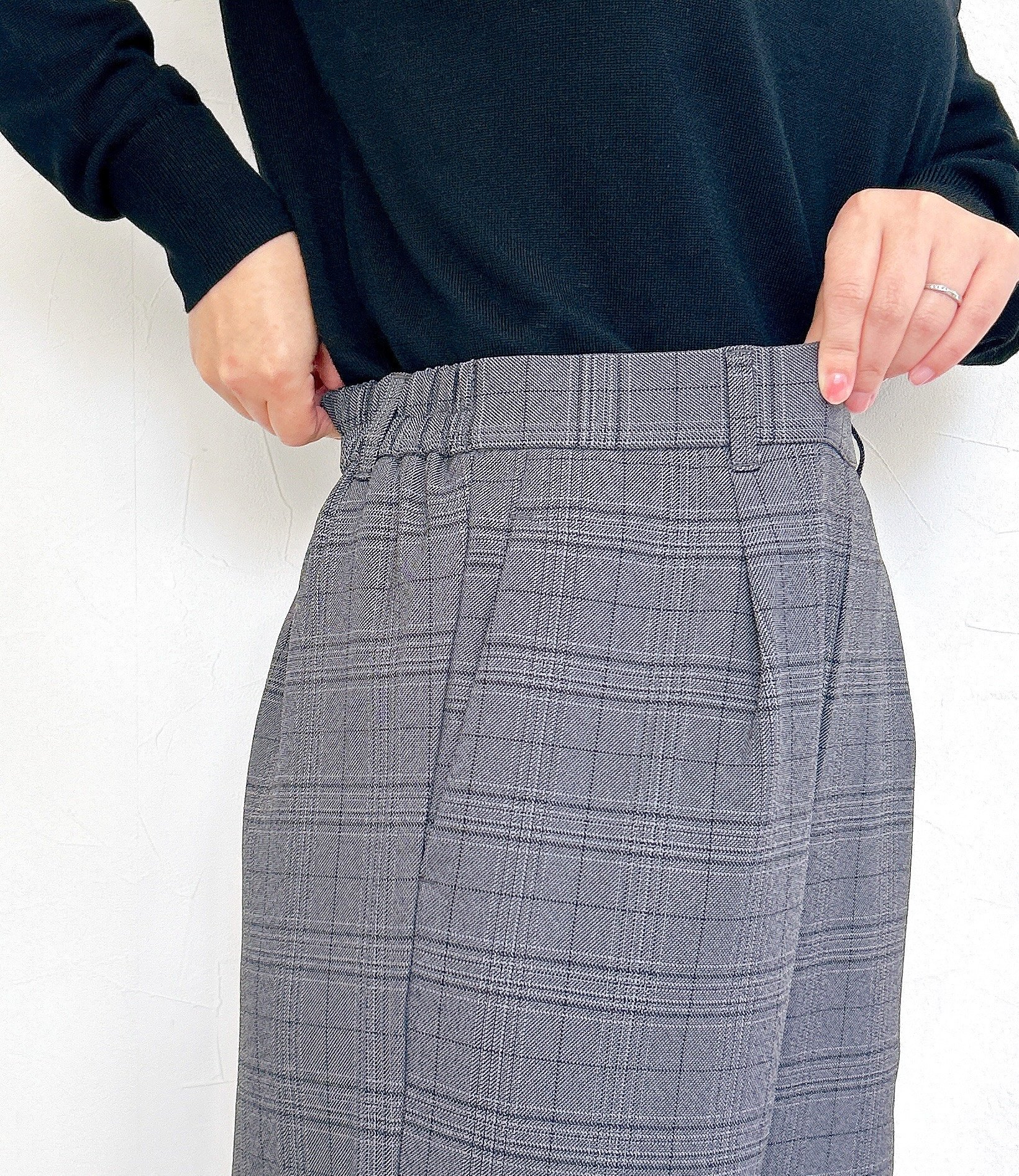 ベルトループが付いていますが、ウエストはゴム仕様で楽ちん。フロントにはタックが入っているから、お腹まわりをスッキリと見せてくれます。
