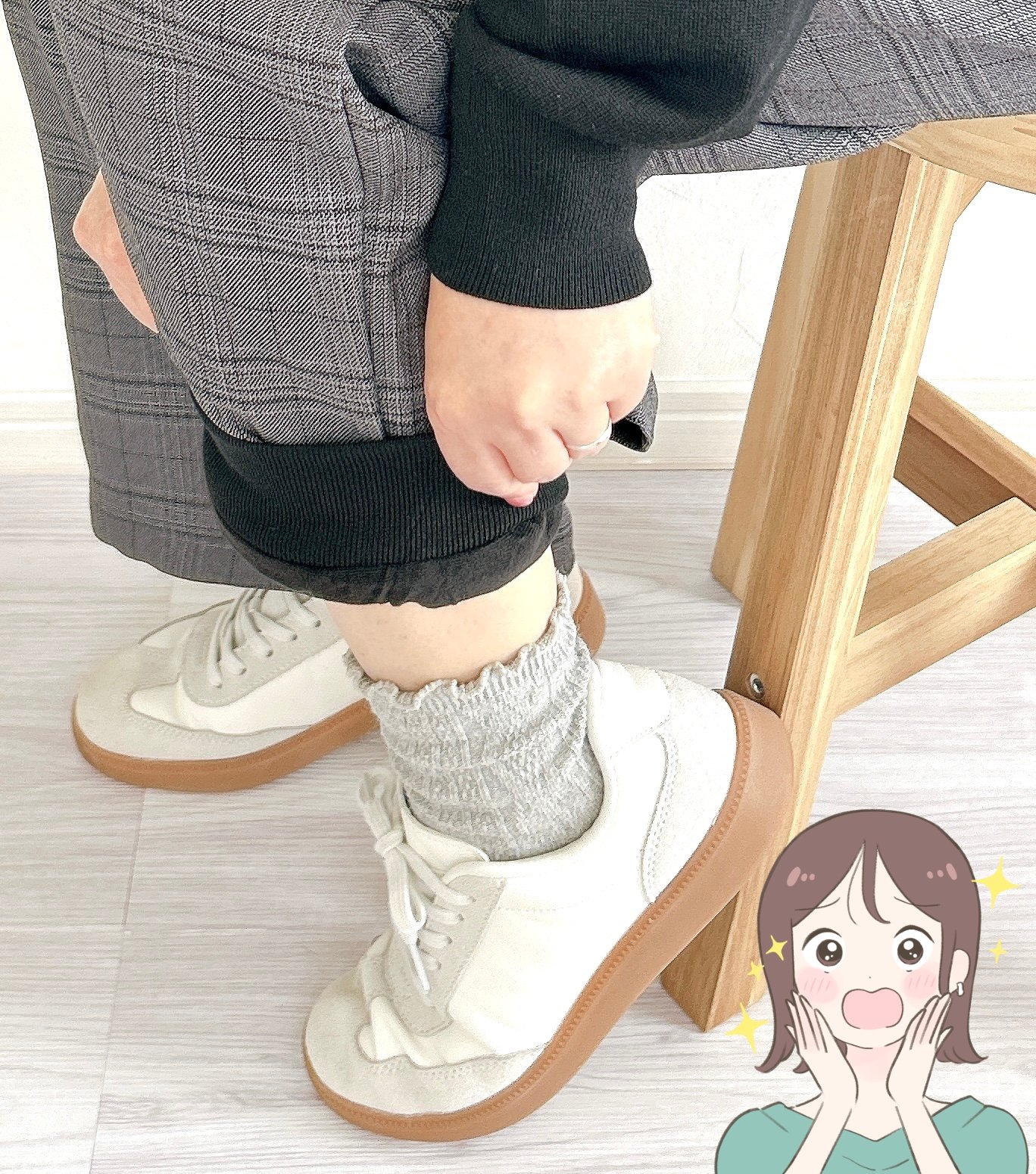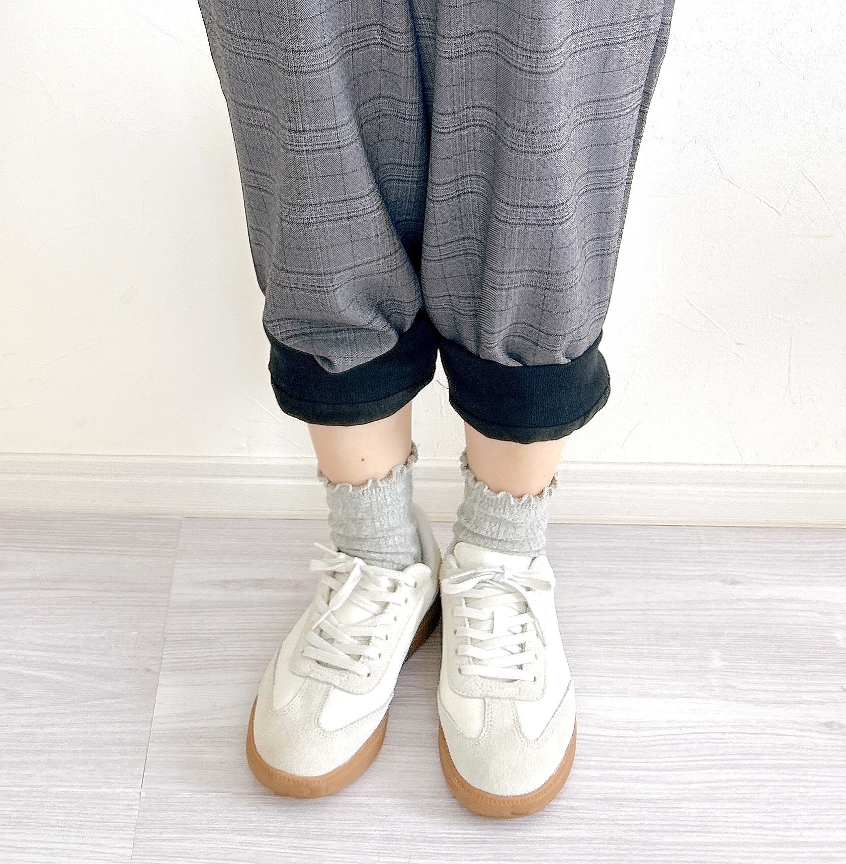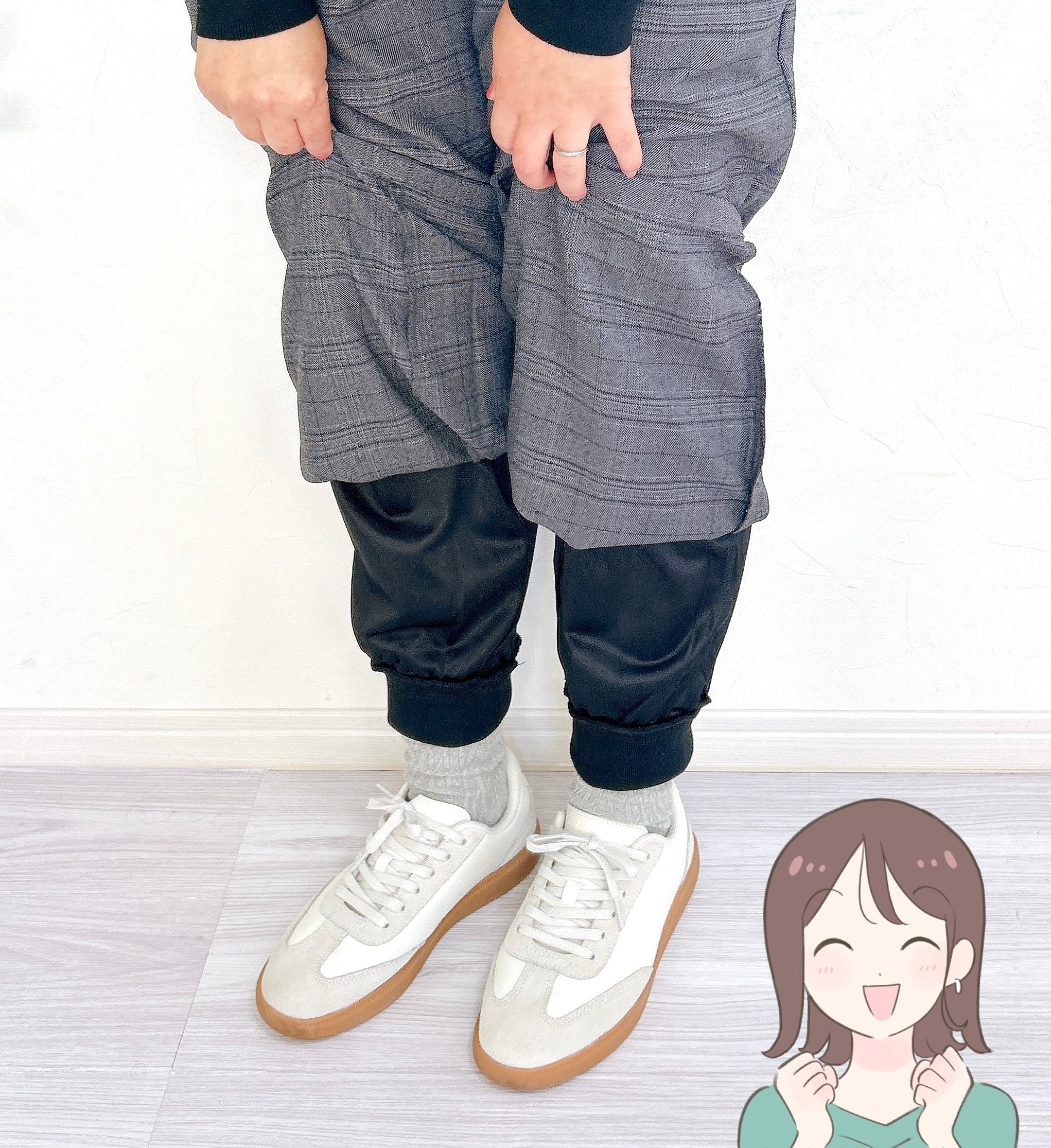 ワイドパンツといえば、トイレで裾が床に着いてしまうのが悩みですよね……。2枚重ねのメリットとして、中のレギンスを外側に折り込むことで裾が床に着かないようにできるんです!