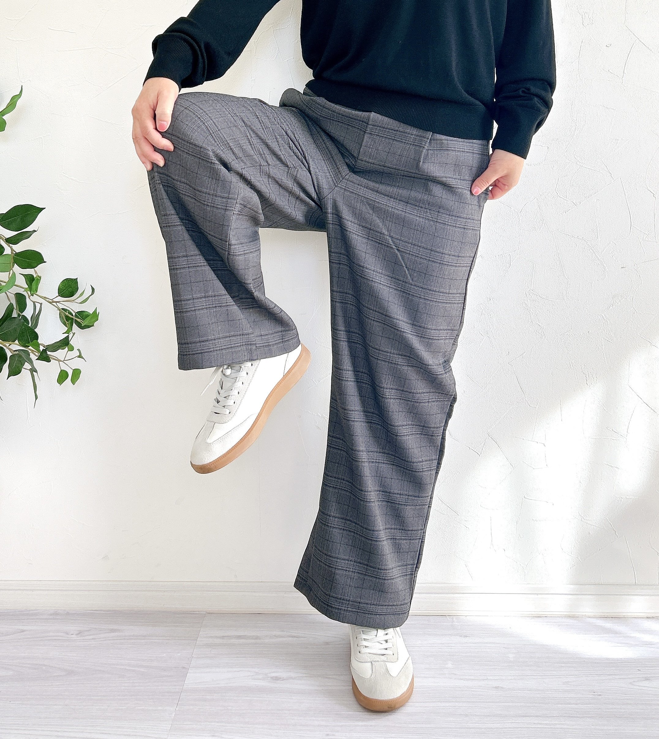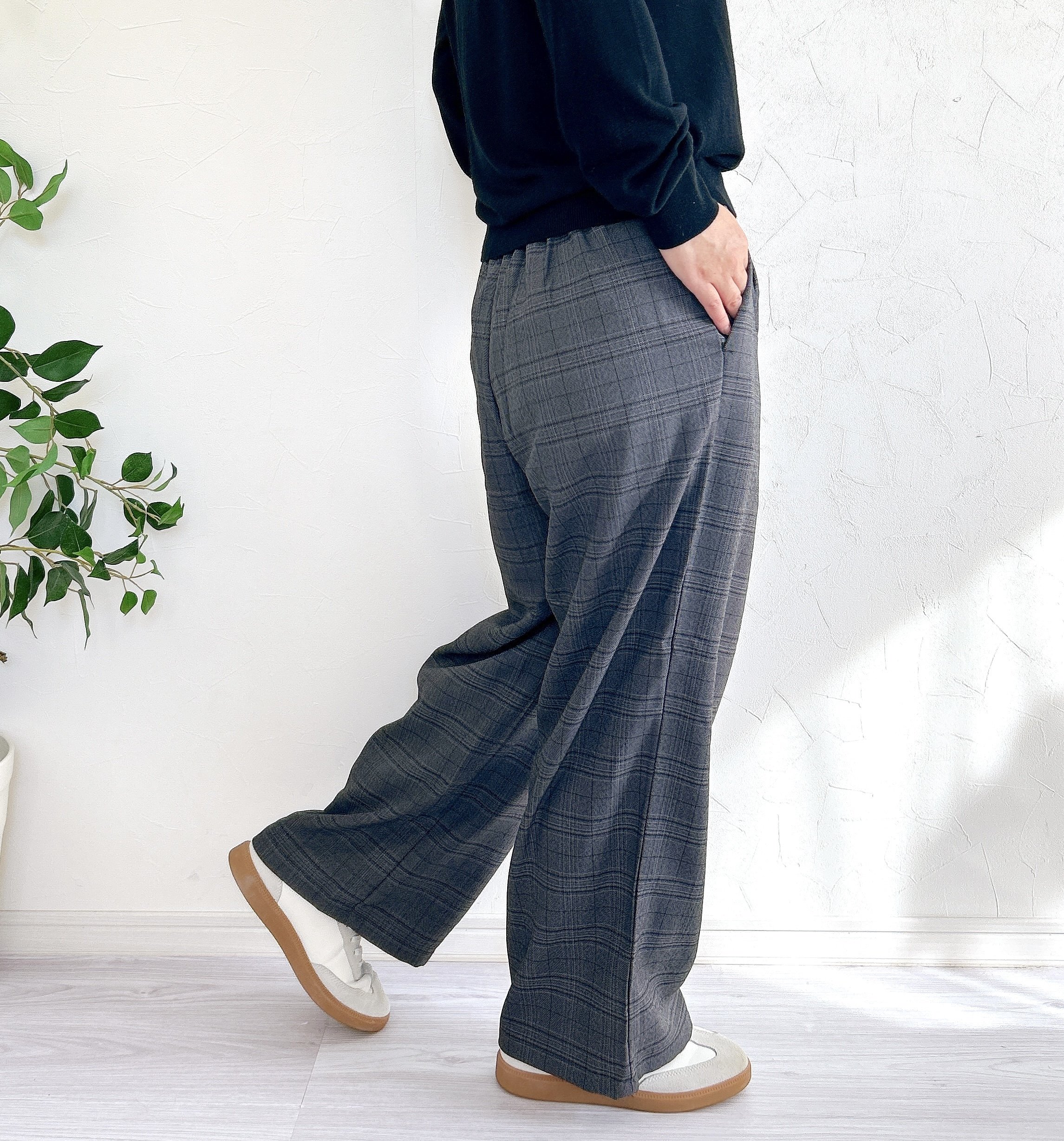 通勤コーデにも使えそうな、きれいめデザインのワイドパンツです。グレーの生地に、優しいチェック柄のラインが入っていて高見えします。
