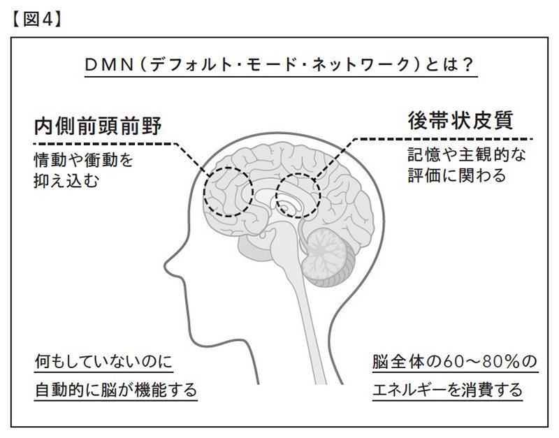 DMNには、内側前頭前野、後帯状皮質、下頭頂小葉、楔前部などの脳の領域が含まれ(【図4】参照)、DMNが活性化されると、新たなアイデアがわくだけでなく、過去の経験が整理されて情報が組み立てやすくなり、記憶や思考がうまくまとまるようになります。