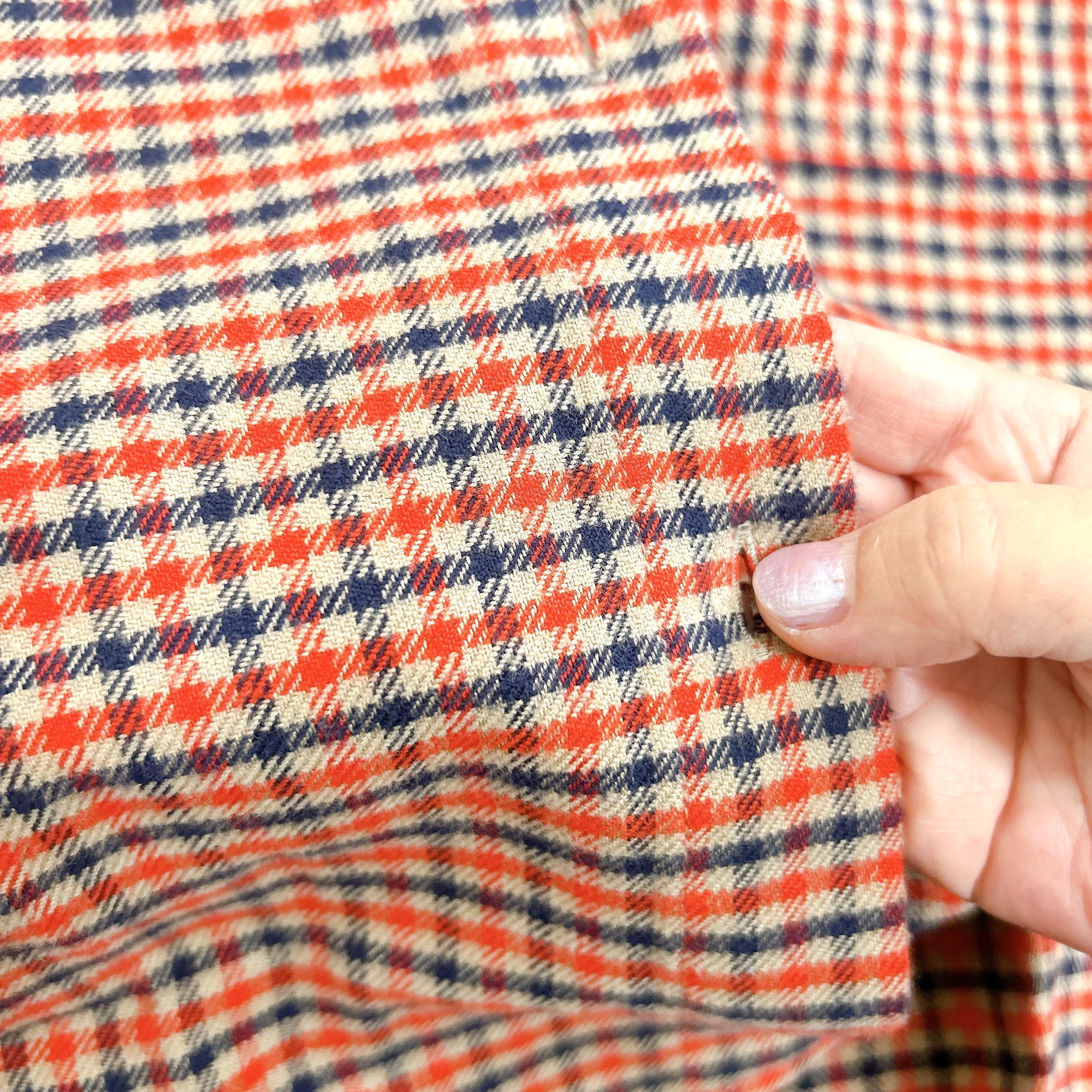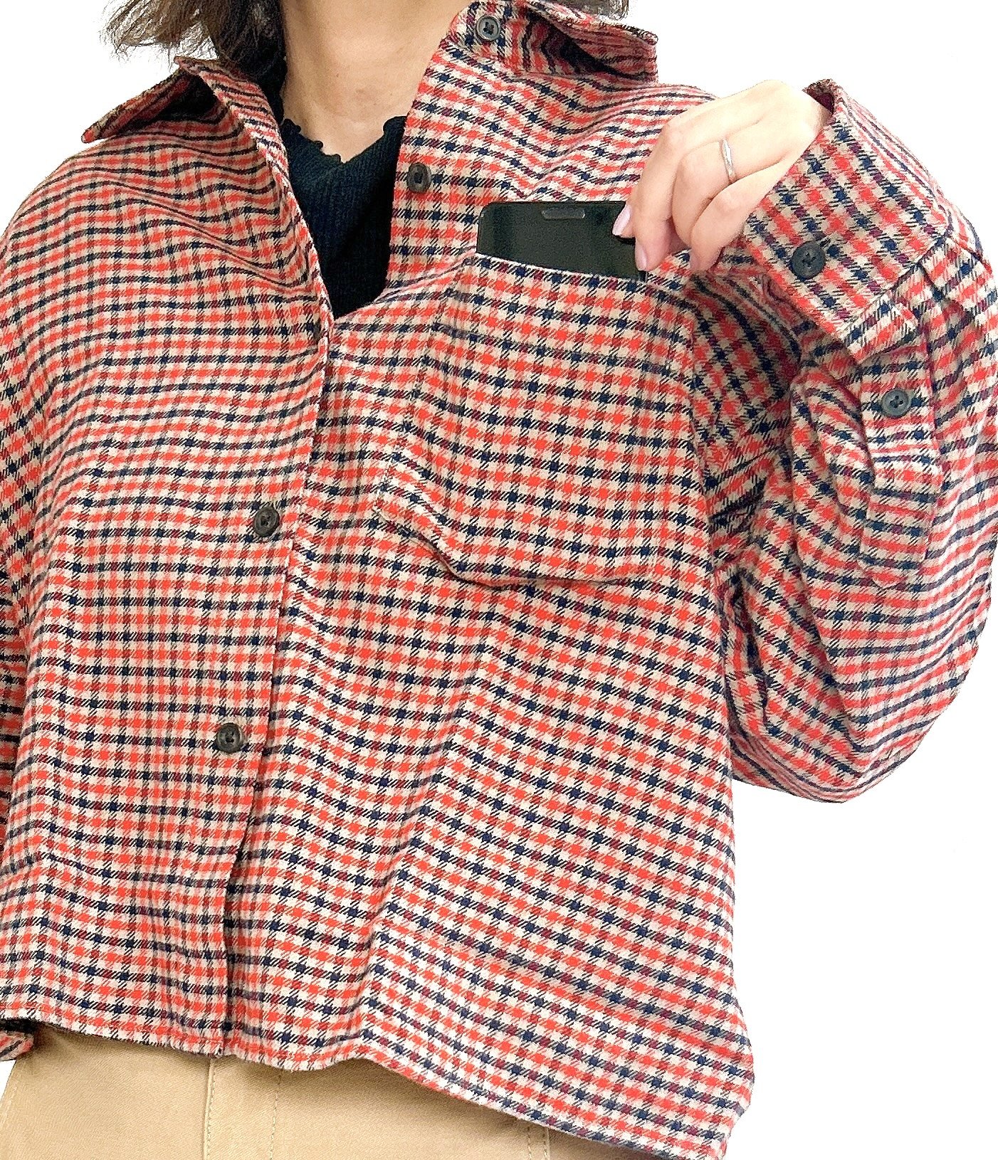 細かいチェック柄がレトロかわいいネルシャツです。購入したレッドは、赤と黒とベージュの配色が秋らしく季節感たっぷりのデザイン!